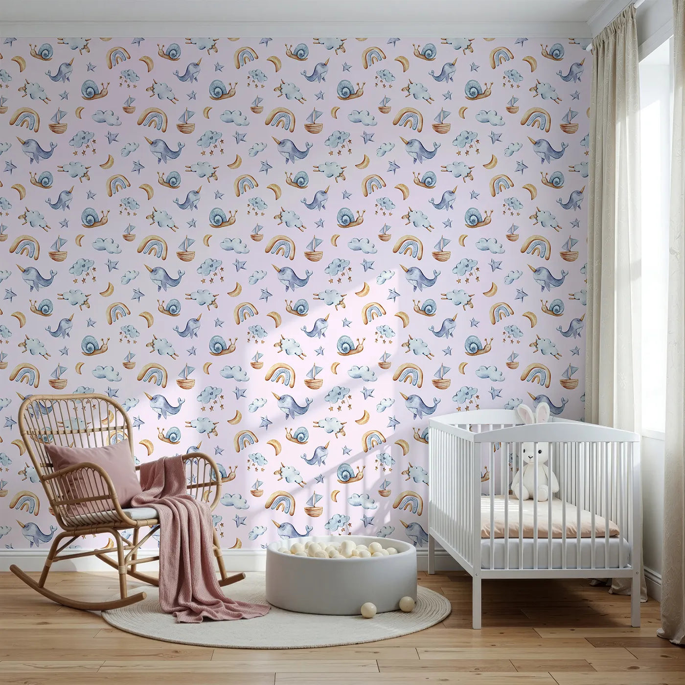 Lovely child standing in front of Whimsy Tots Dreamscape Journey Wallpaper in Blush Pink with narwhal, snail, whale, sheep, moon, star, rainbow, boat, cloud in design.