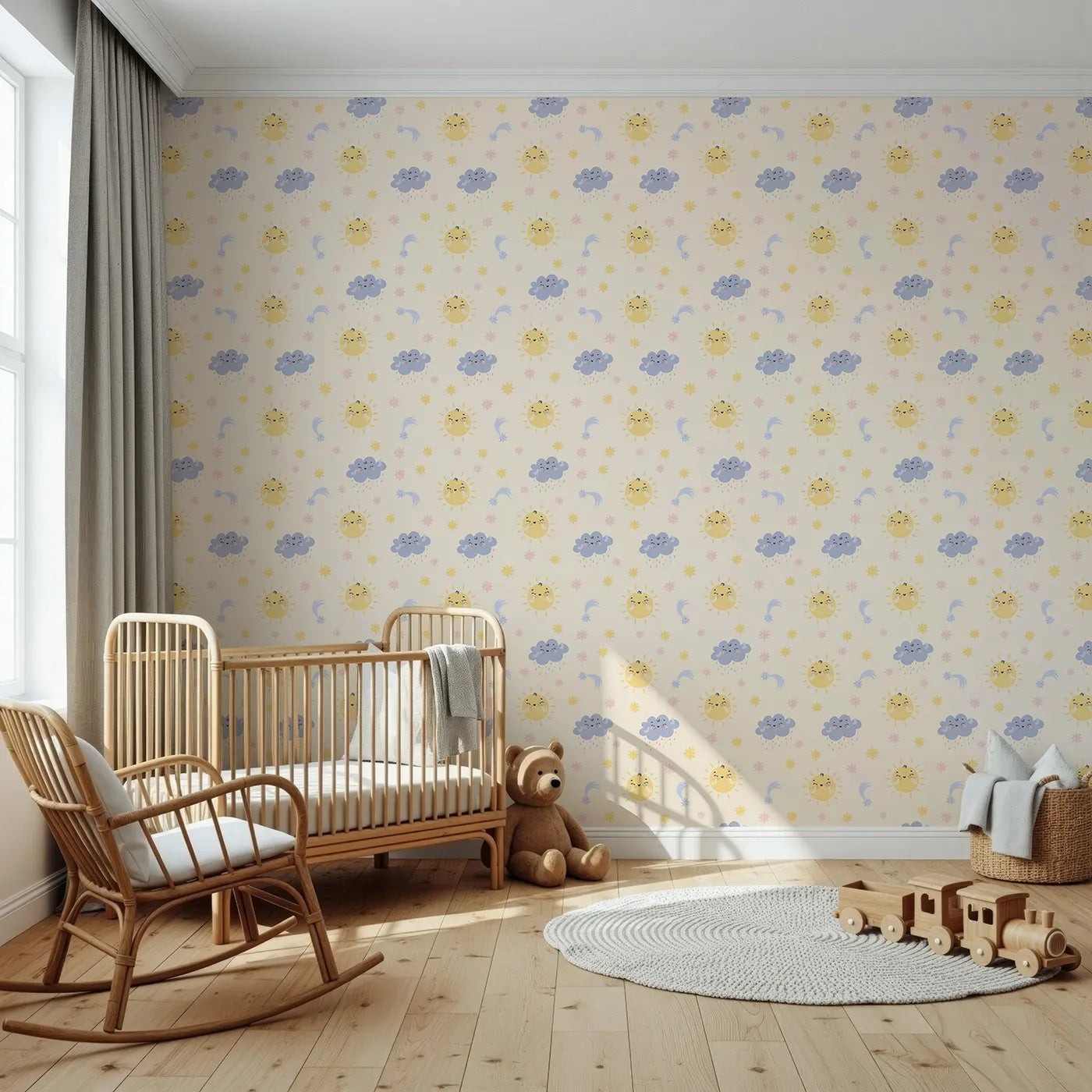 Front view of Whimsy Tots' Sun and Cloud Kiss Wallpaper in Vanilla