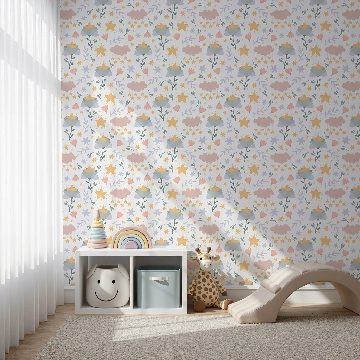 Front view of Whimsy Tots' Starlight Blossom Dreams Wallpaper in Morning Sky