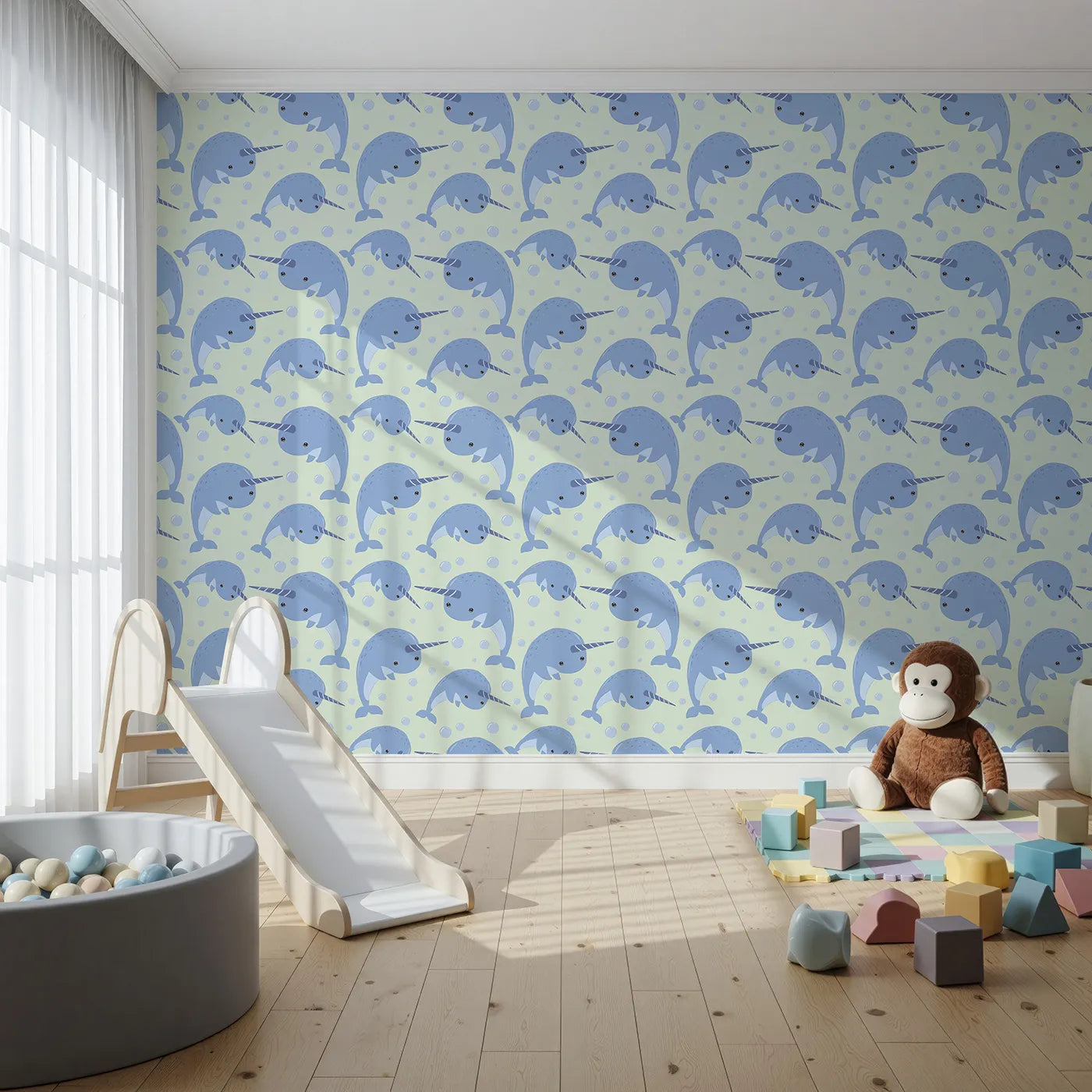 Bubbly Narwhal Parade Wallpaper in Mint Green