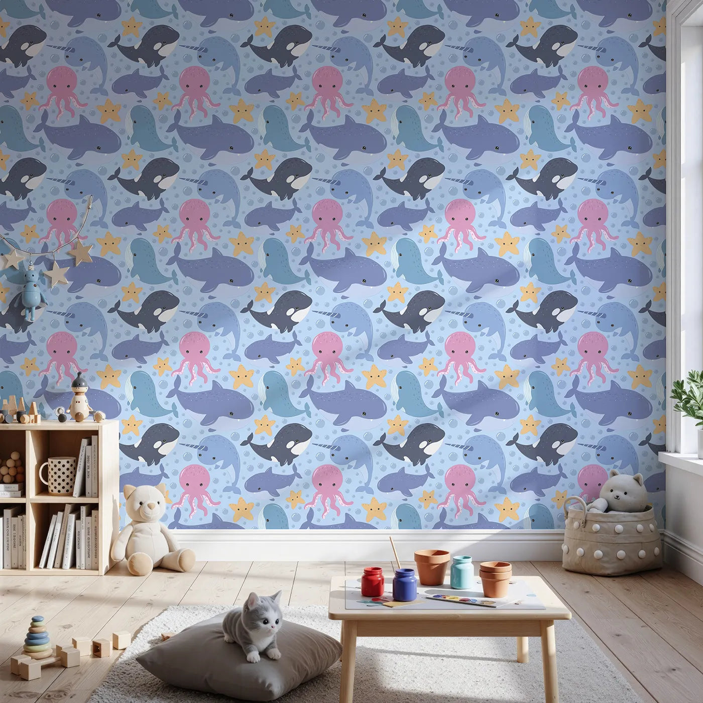 Lovely child standing in front of Whimsy Tots Ocean Buddy Parade Wallpaper in Blue with whale, dolphin, shark, narwhal, octopus, starfish, bubble in design.