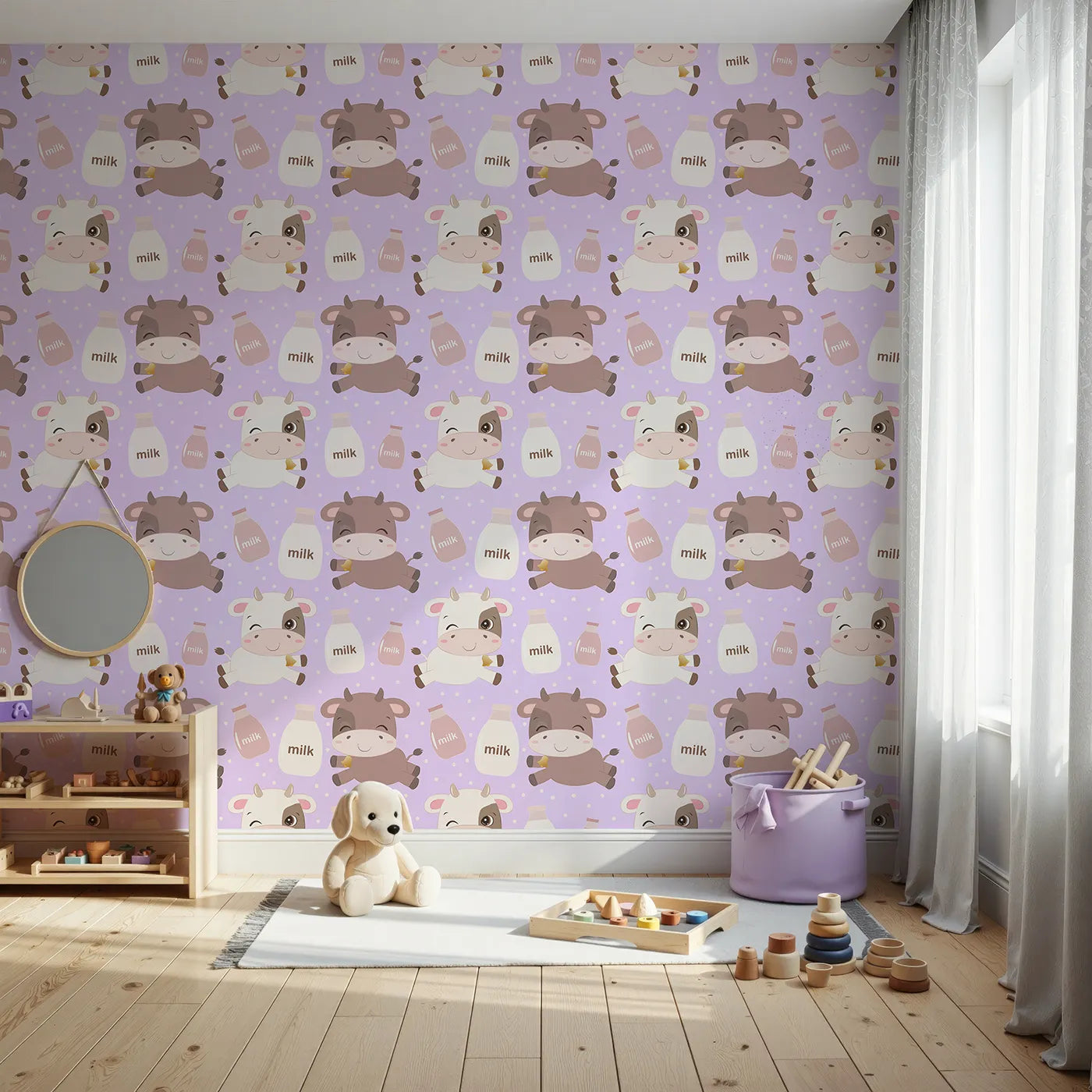Front view of Whimsy Tots' Moo Moo Milk Parade Wallpaper in Purple