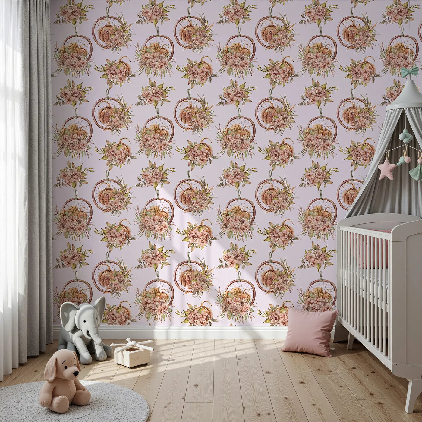 Front view of Whimsy Tots' Harvest Bloom Hoop Wallpaper in Blush Pink