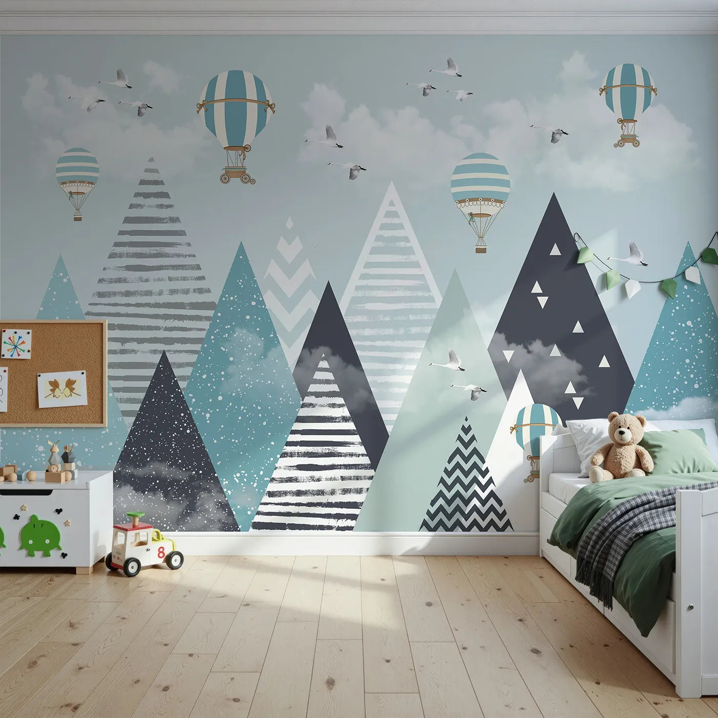 Front view of Whimsy Tots' Geometric Mountain Air Show Wall Mural