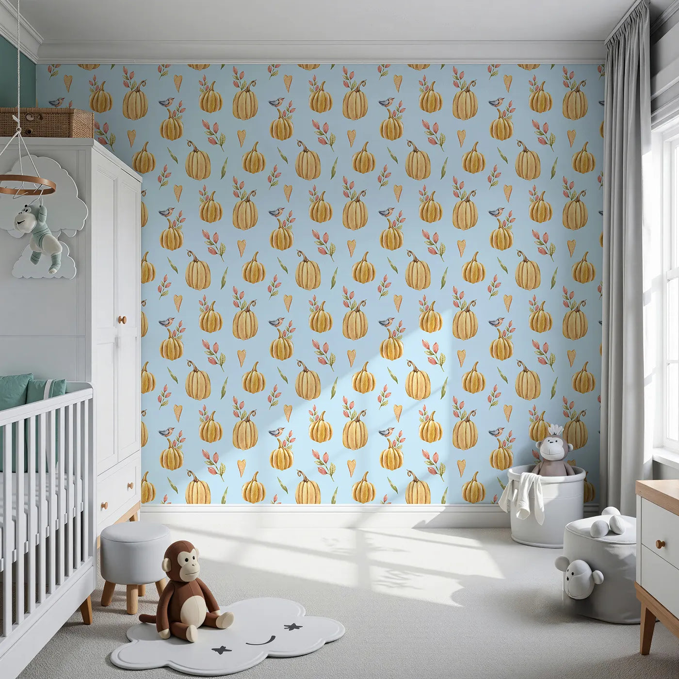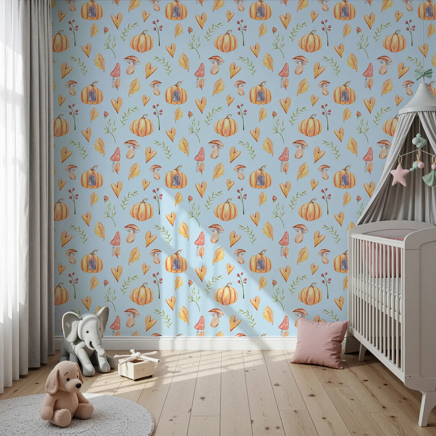 Front view of Whimsy Tots' Pumpkin Heart Harvest Wallpaper in Sky Blue