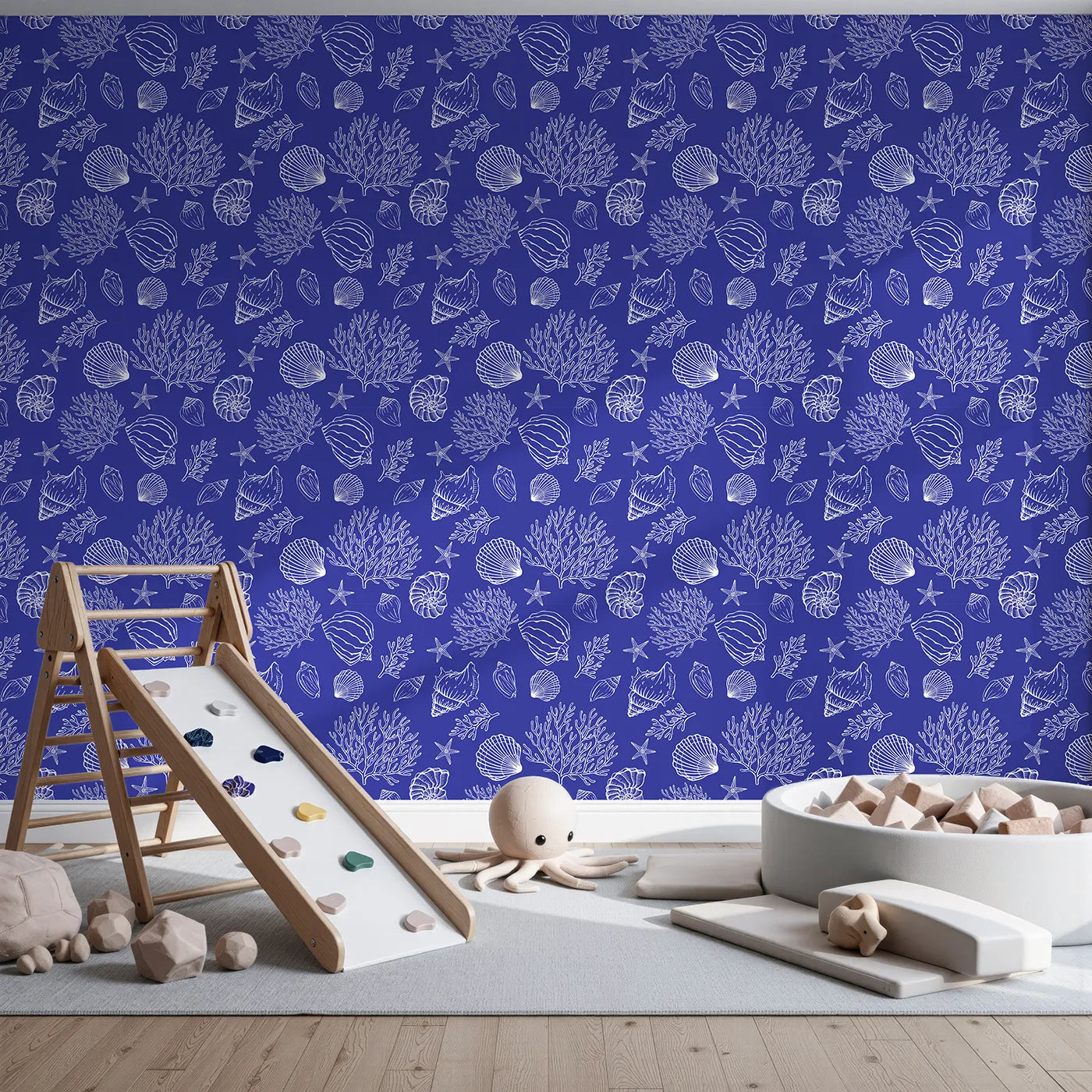Front view of Whimsy Tots' Seashell Sketch Wallpaper in Blue