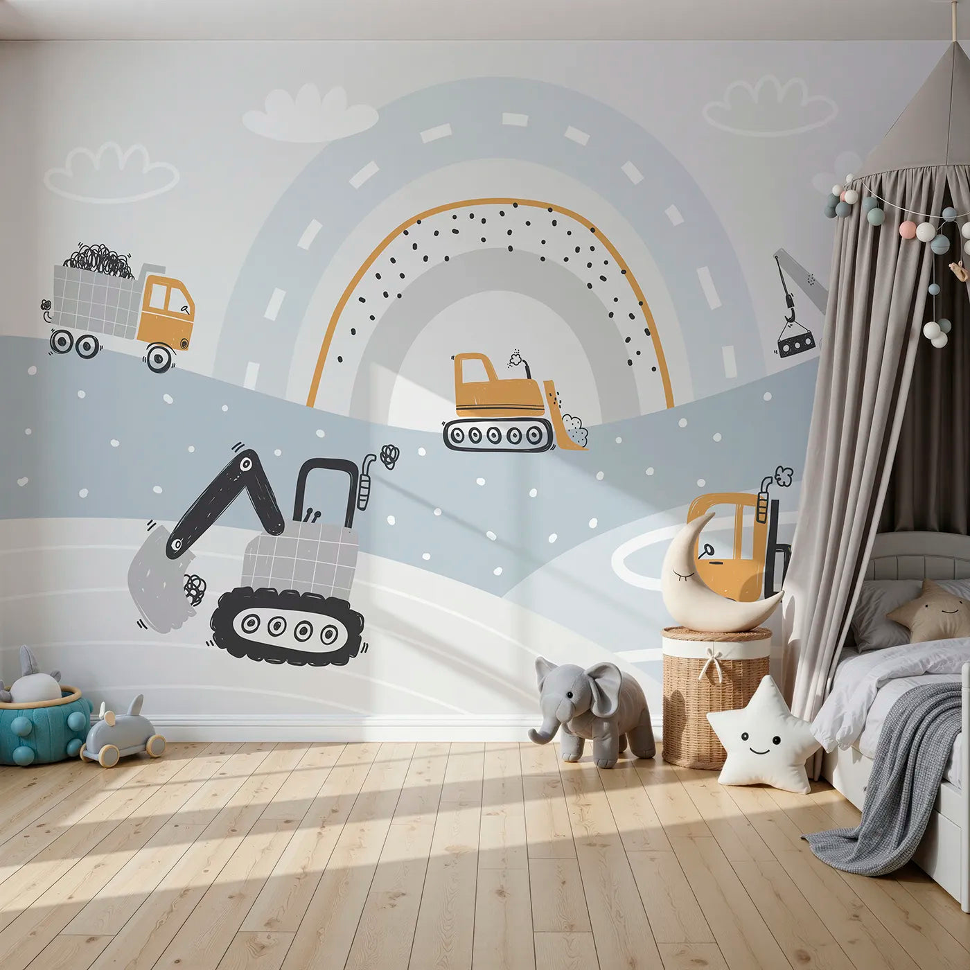 Front view of Whimsy Tots' Rainbow Construction Zone Wall Mural