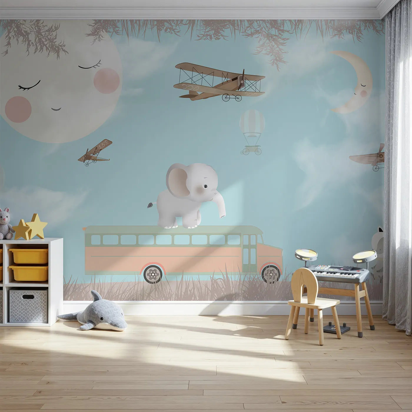 Front view of Whimsy Tots' Vintage Sky Parade Wall Mural