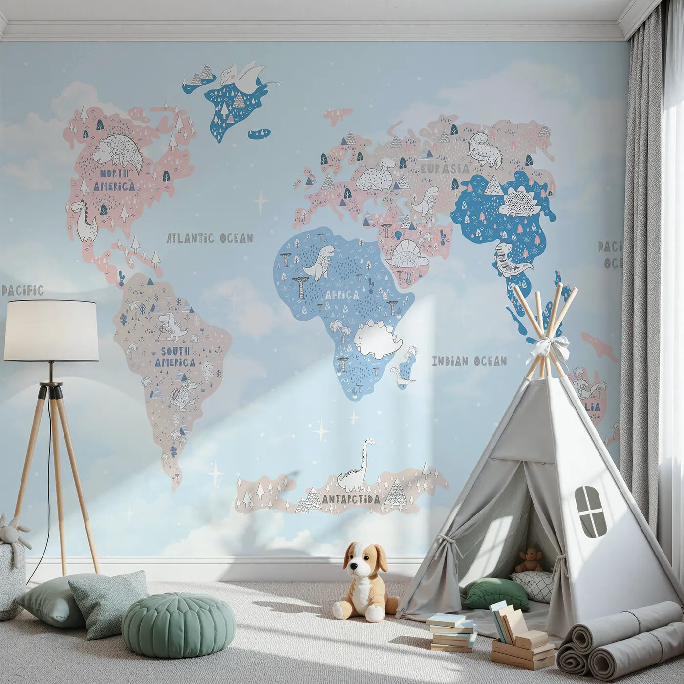 World maps are incredibly versatile and can be styled to fit any aesthetic. For a playful and educational nursery or playroom, choose one of our colorful <b>murals</b> that features cute, cartoon animals on their native continents. For a more vintage, sophisticated, or older child's room, a map in muted, sepia tones can create a stunning and timeless feature wall that feels like an explorer's study. Because a map mural is such a strong statement piece, it works best on a single, uninterrupted feature wall where it can be fully appreciated.