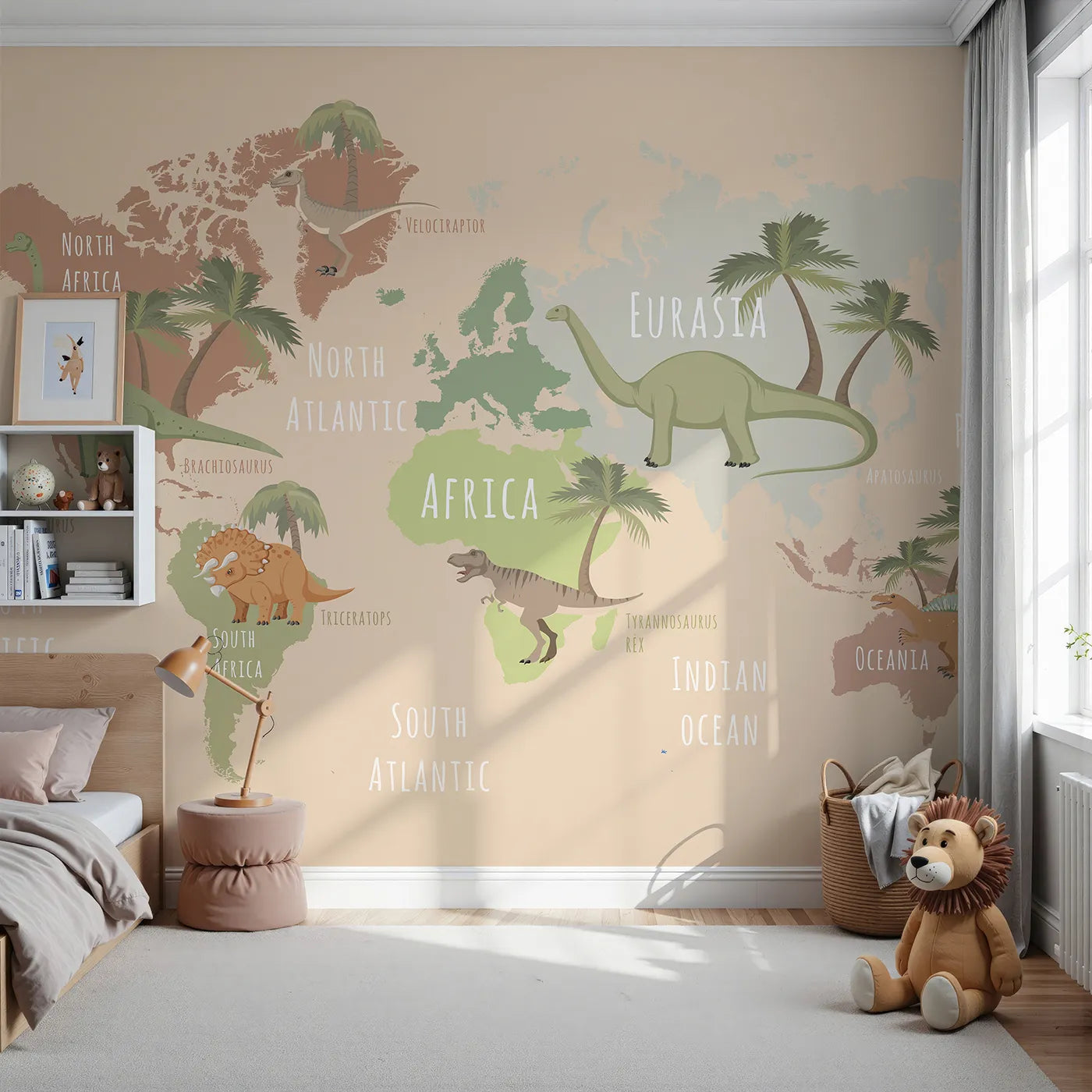 Front view of Whimsy Tots' Neutral Dinosaur World Map Wall Mural