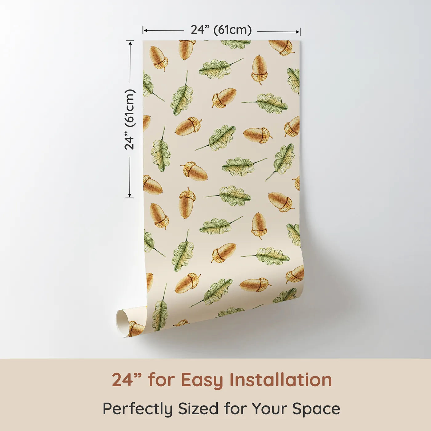 This beautiful woodland wallpaper features a simple, elegant pattern of watercolor acorns and oak leaves. The soft, natural style on a warm cream background creates a calm and soothing atmosphere, making it a perfect choice for a gender-neutral nursery or a modern playroom.