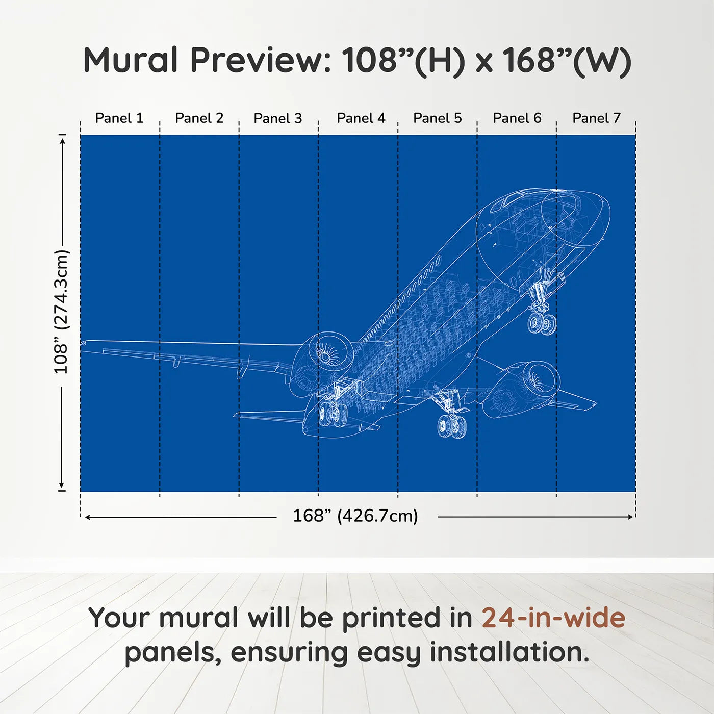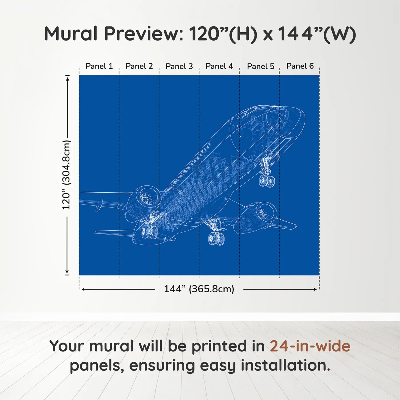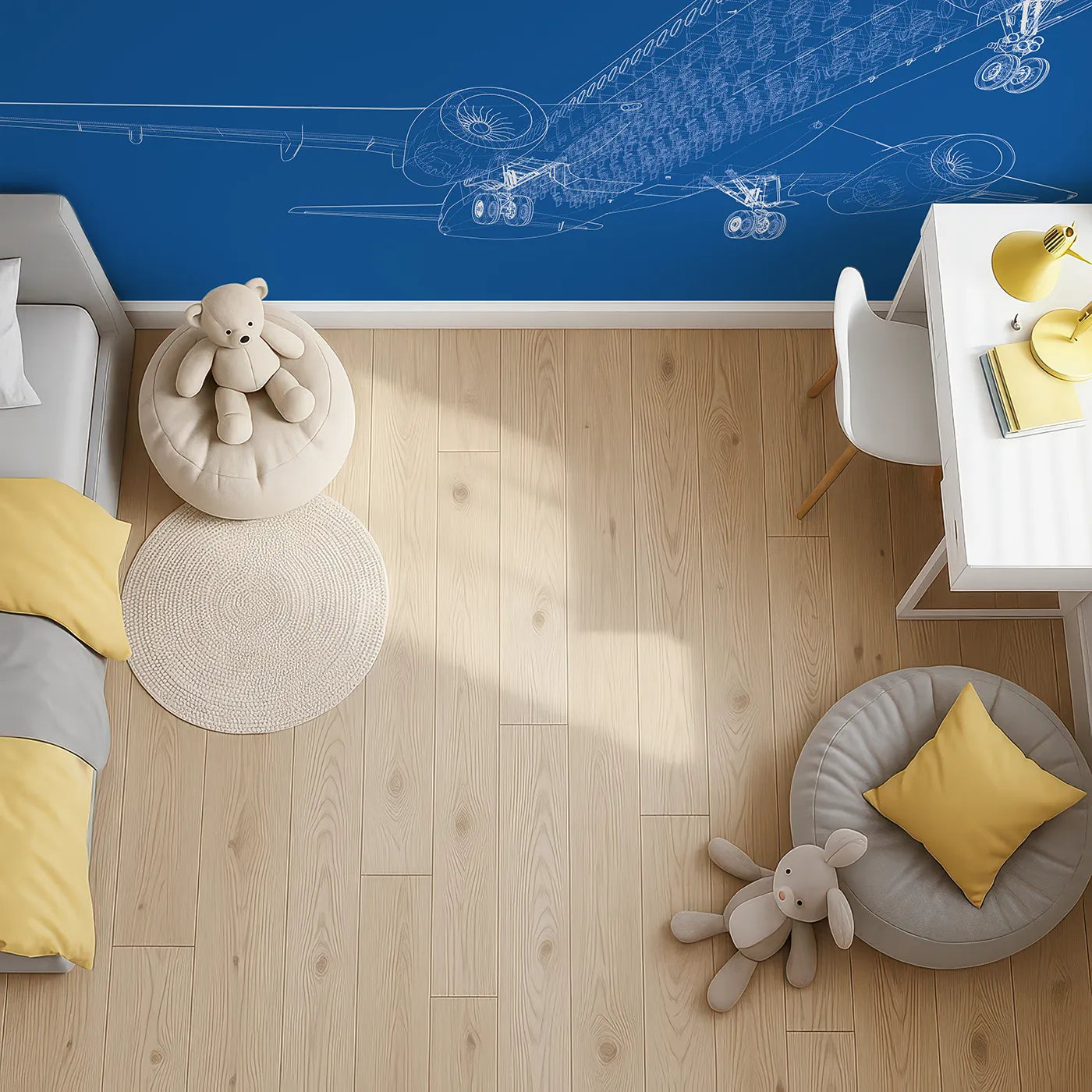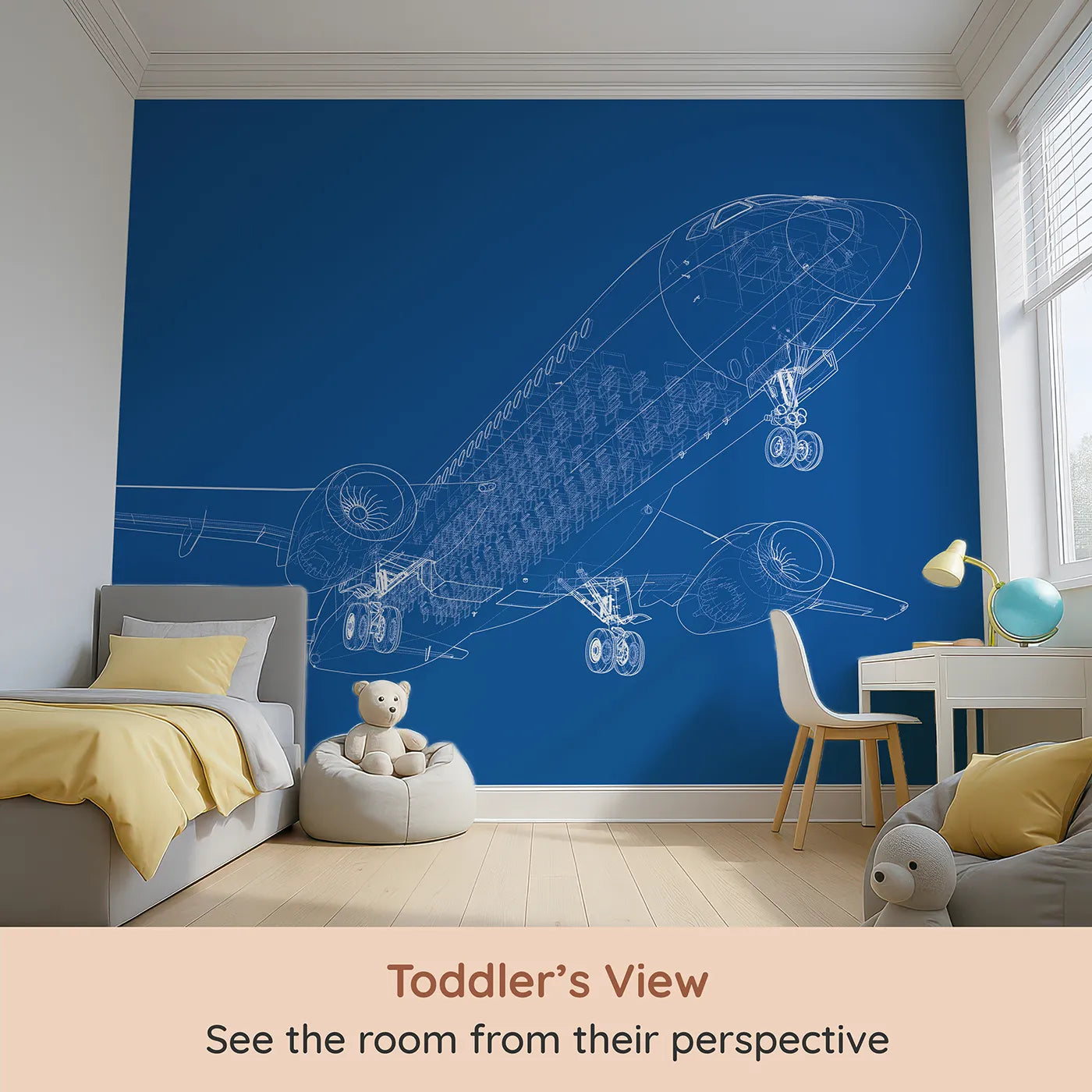 This unique and educational wall mural features a detailed, technical blueprint of an airplane against a classic blue background. The white line drawings show the inner workings and structure of the aircraft, making it a perfect design for a curious kid with a love for how things work.
