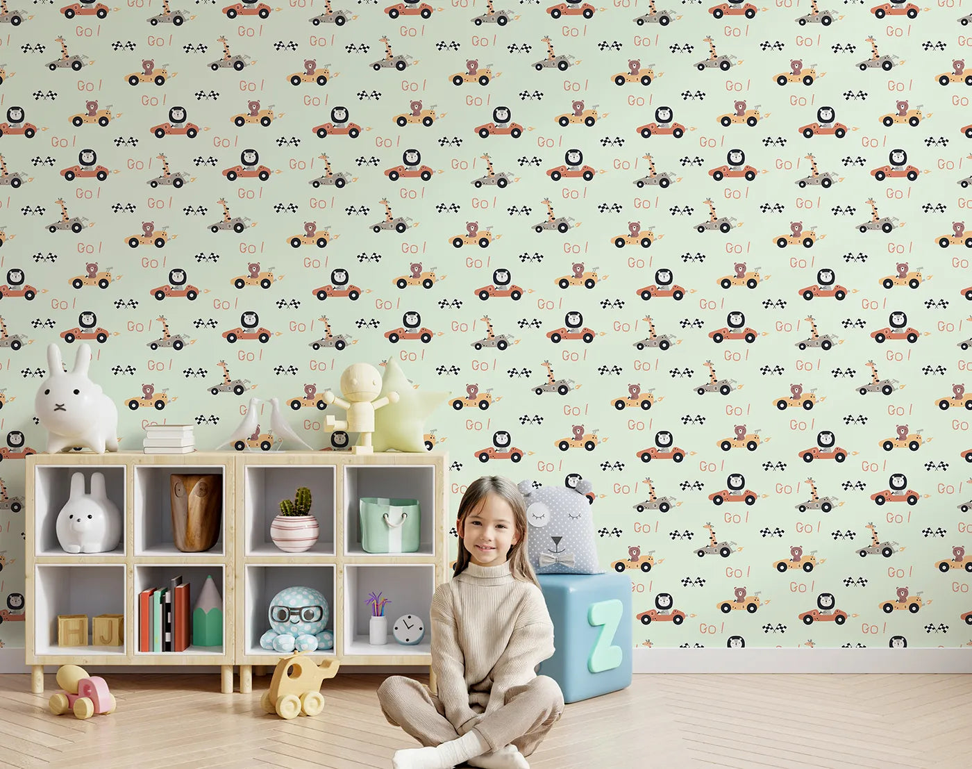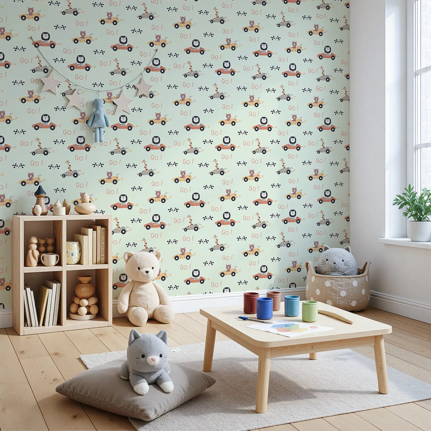 This fun cars wallpaper features a delightful race between safari animals in colorful cars. A lion, elephant, and giraffe zoom past in a simple, modern style on a mint green background, creating a playful and energetic scene that will delight any child who loves cars and animals.
