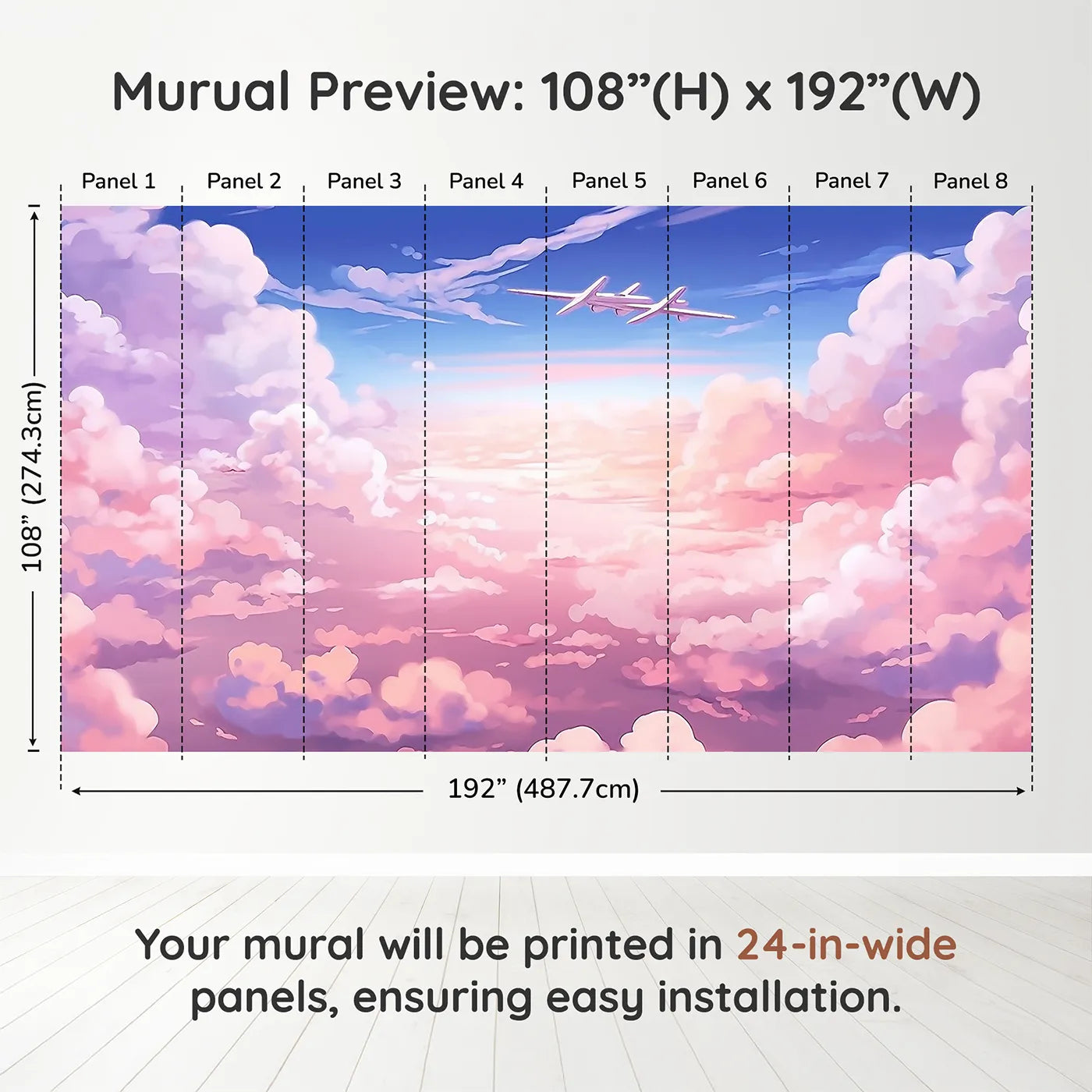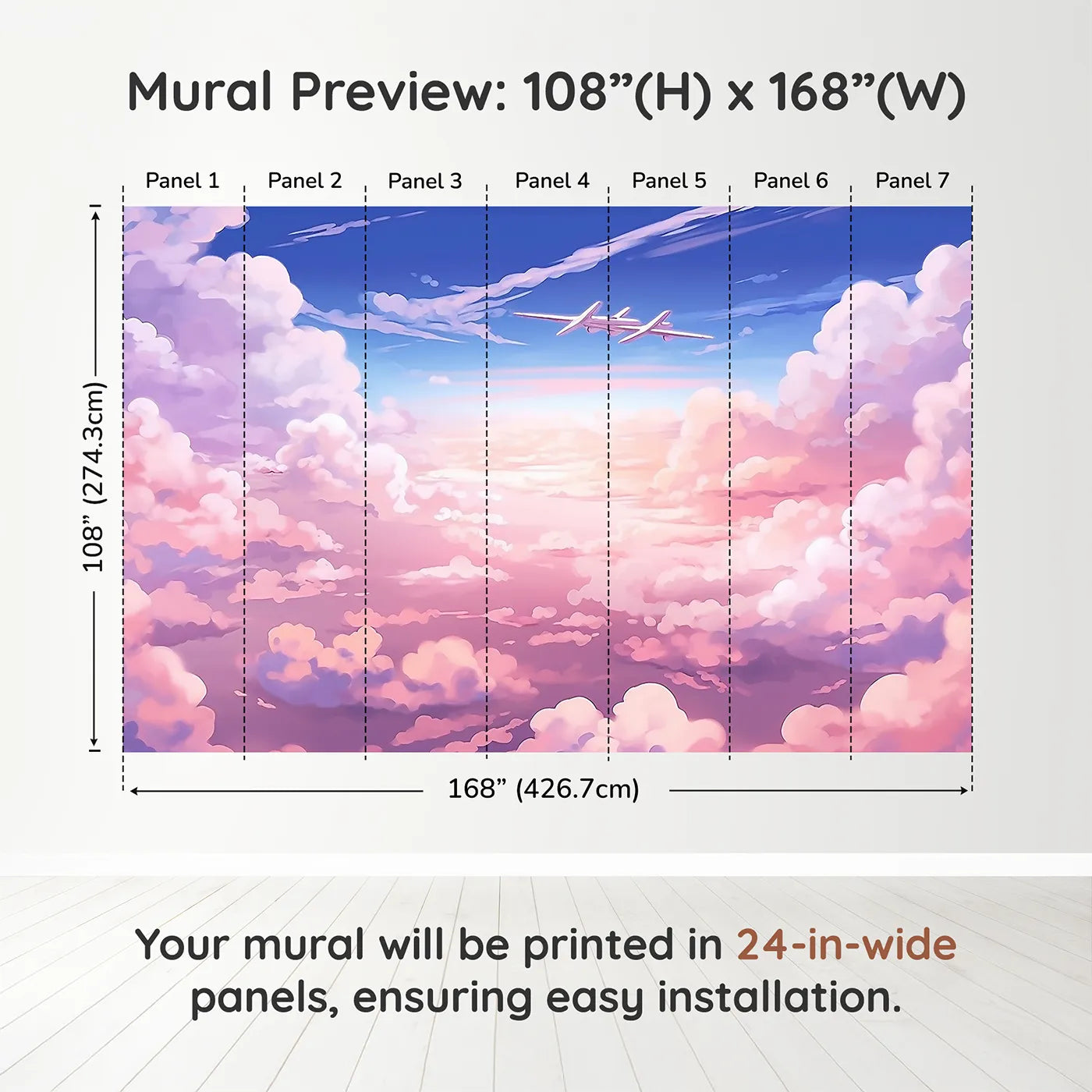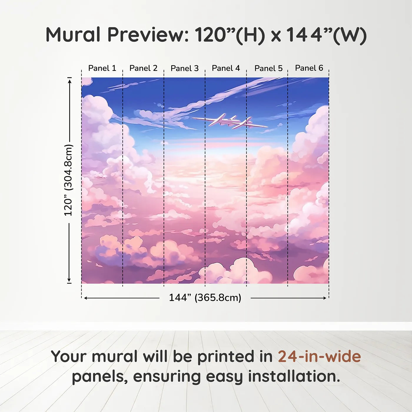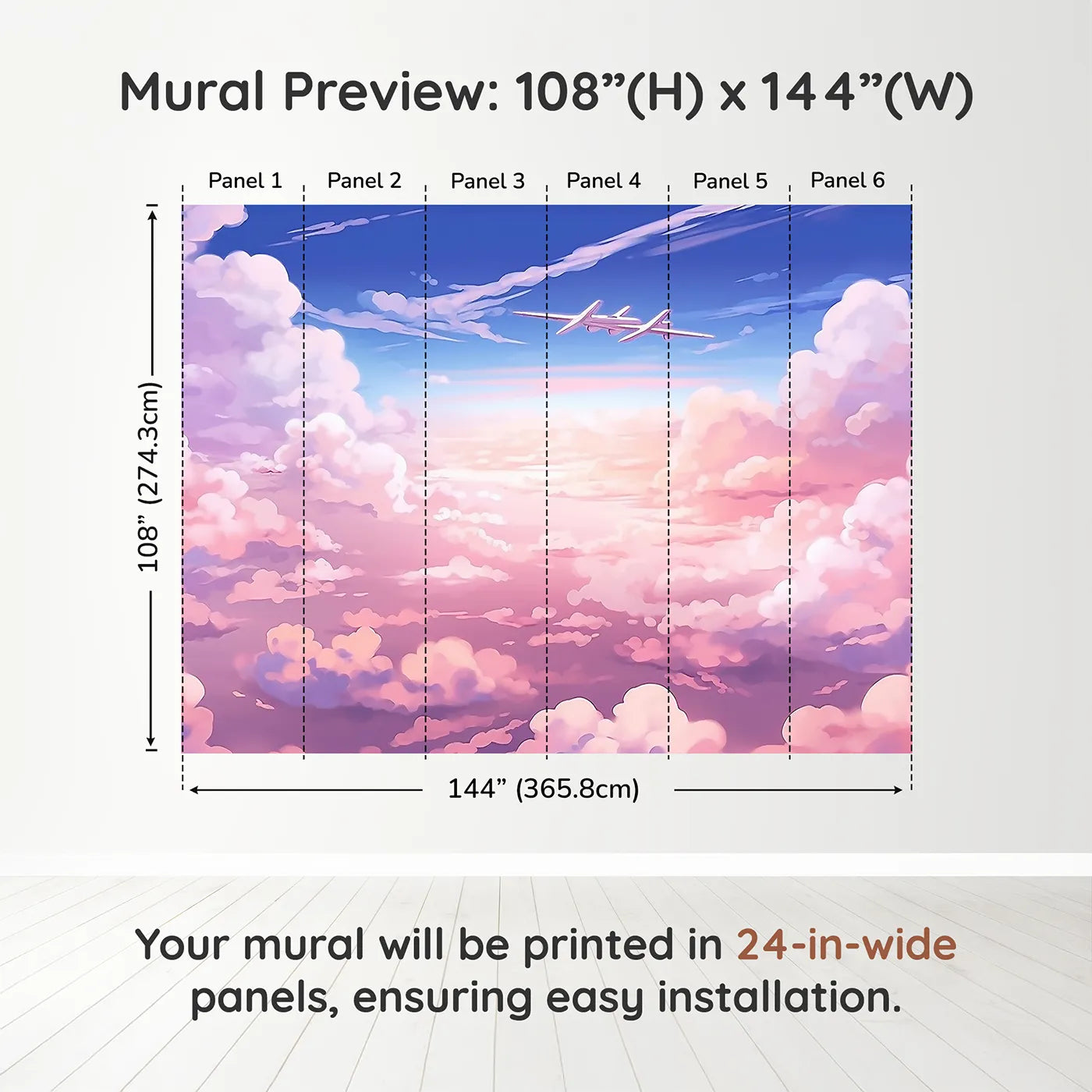 This charming wall mural features a stunning, anime-inspired sky full of soft, glowing clouds in shades of pink and lavender. A vintage-style airplane glides gracefully in the distance, adding a touch of adventure to the serene scene. Itβs an imaginative view that inspires calm and wonder.
