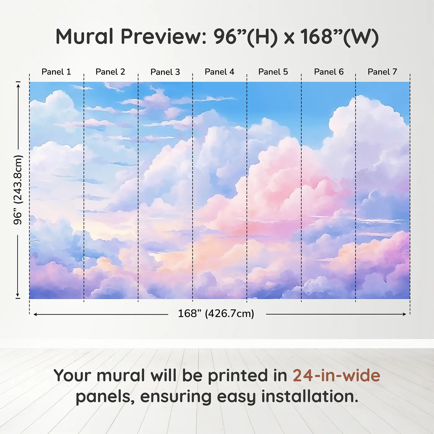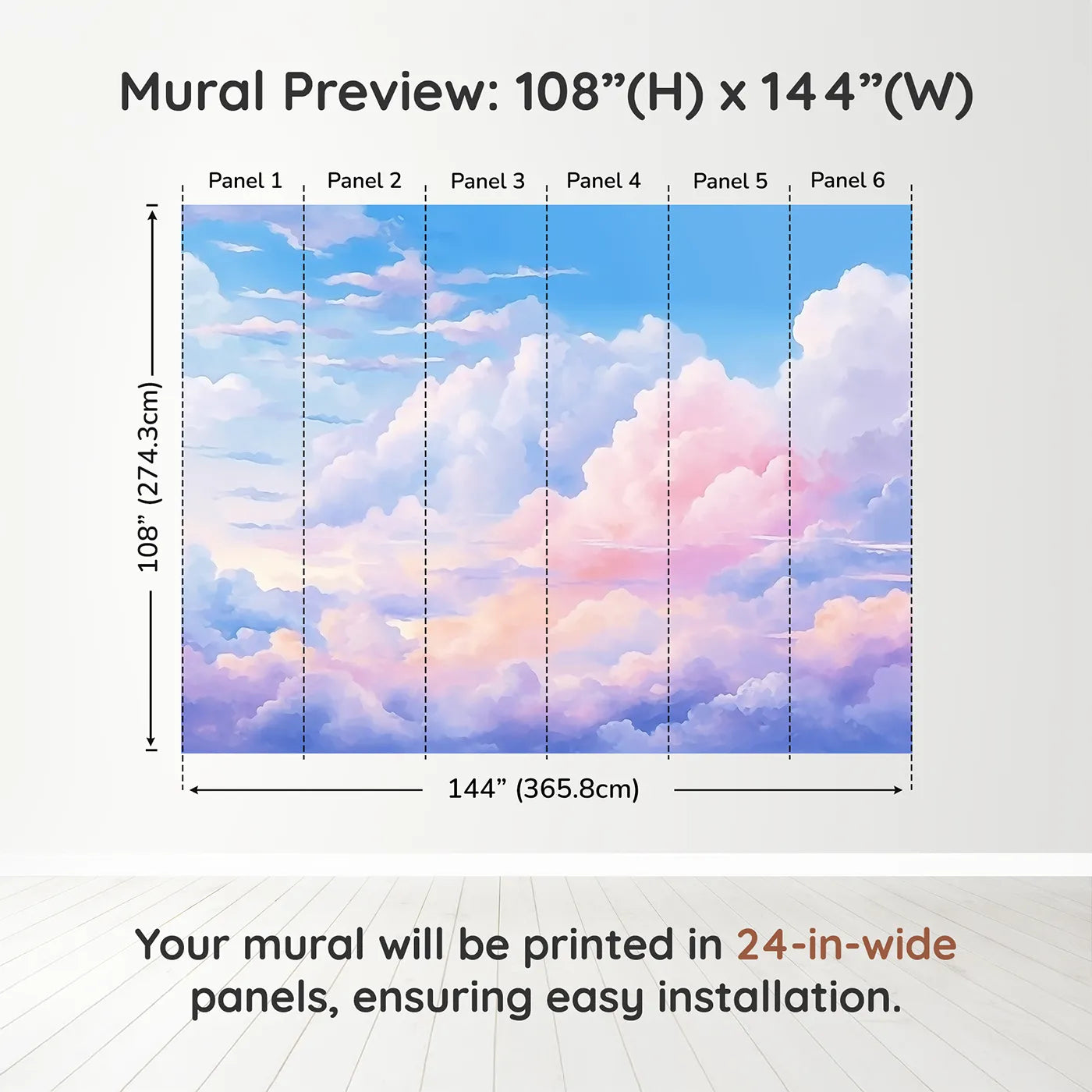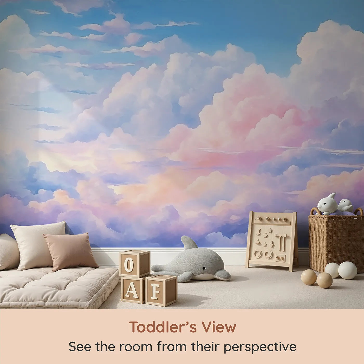 Let them drift off to sleep surrounded by the calming magic of this beautiful sky wall mural. Inspired by dreamy anime art, this design features fluffy, voluminous clouds painted in soft pastel shades of pink, purple, and blue. It creates a serene and wonderfully imaginative atmosphere.