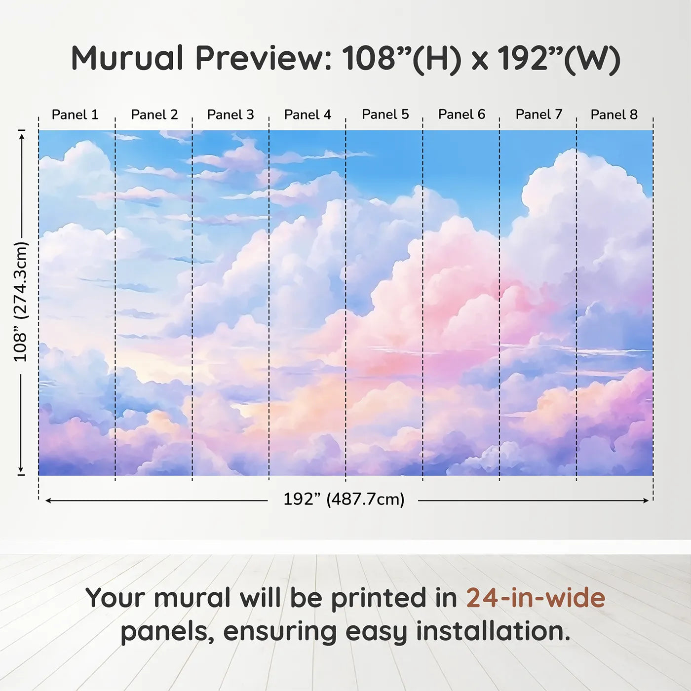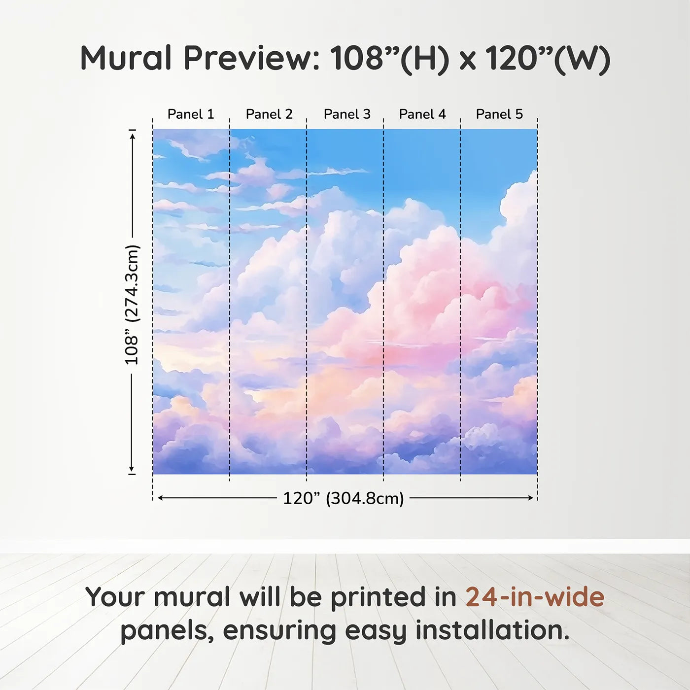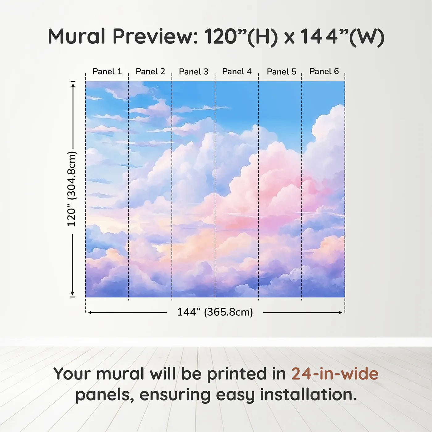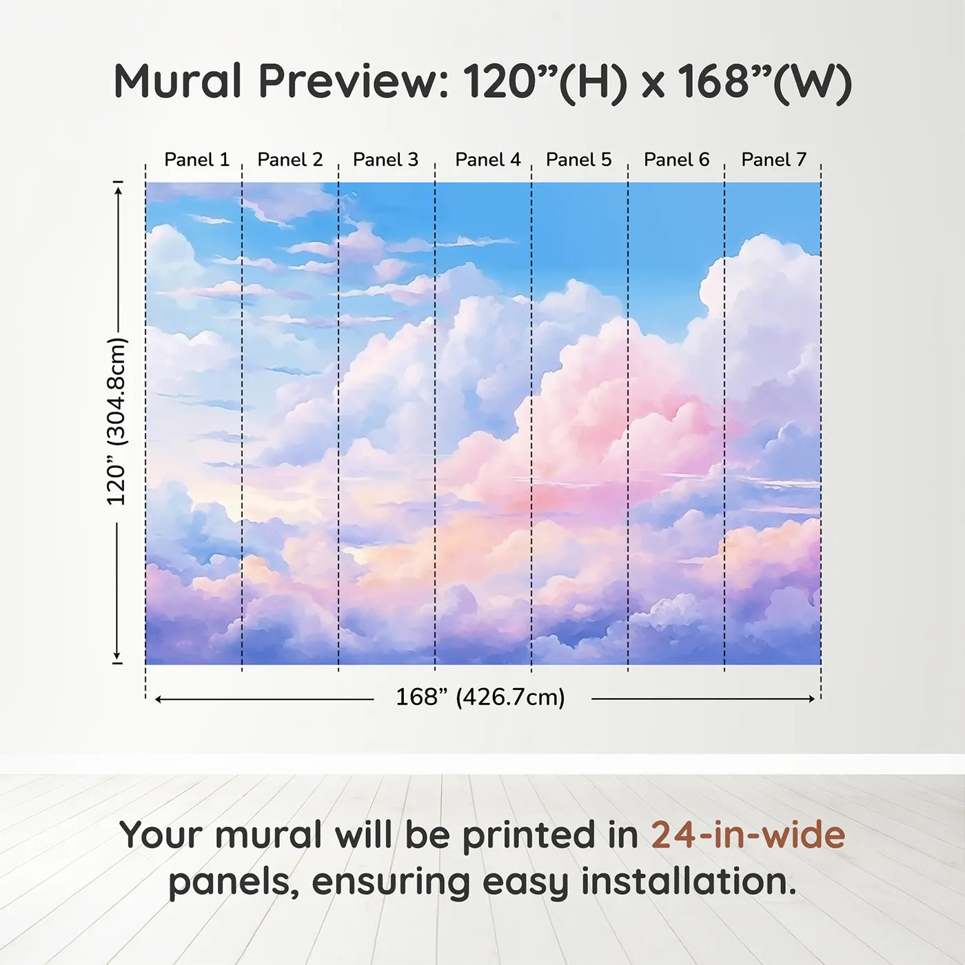 Let them drift off to sleep surrounded by the calming magic of this beautiful sky wall mural. Inspired by dreamy anime art, this design features fluffy, voluminous clouds painted in soft pastel shades of pink, purple, and blue. It creates a serene and wonderfully imaginative atmosphere.