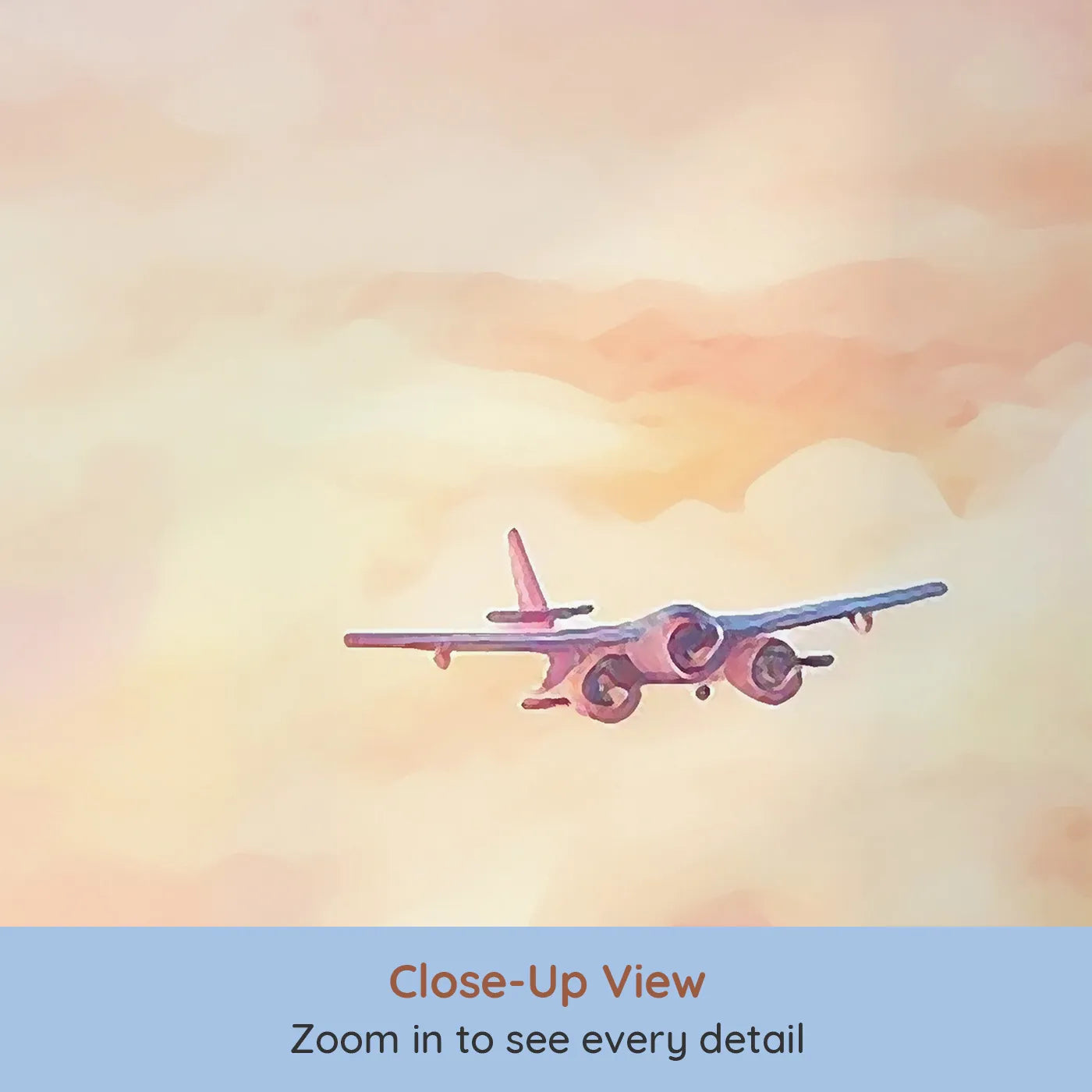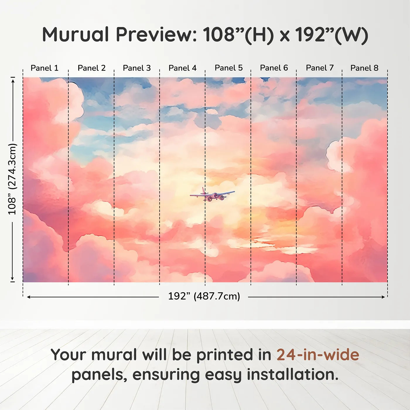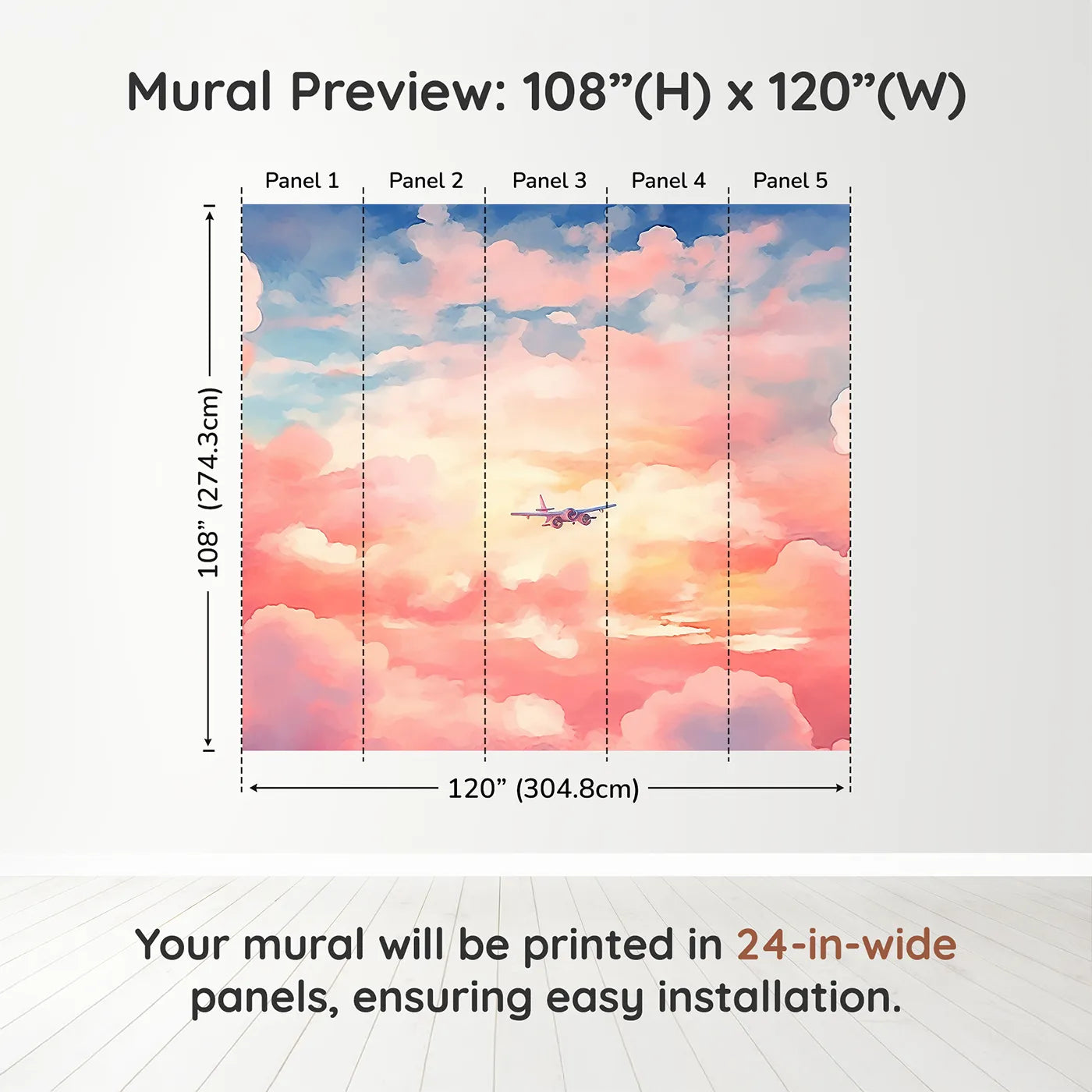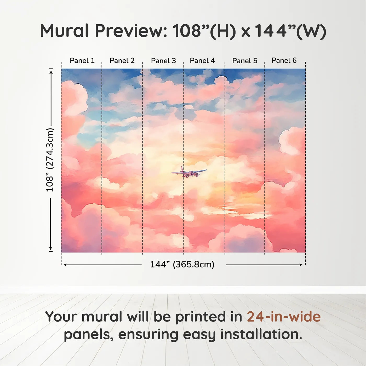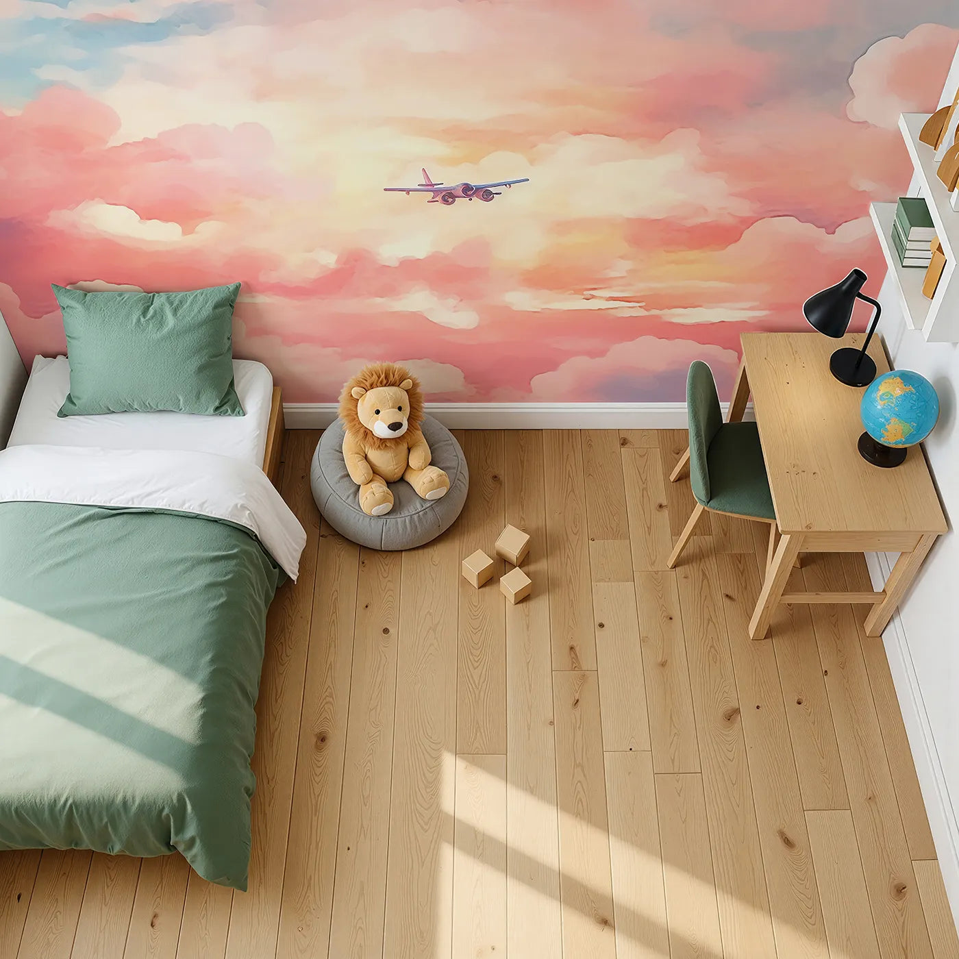 Spark your little one's imagination with this breathtaking anime-style wall mural. A classic airplane soars through a magnificent sky filled with glowing, sunset-pink clouds. The art style is both dreamy and adventurous, perfect for a child who looks to the skies.