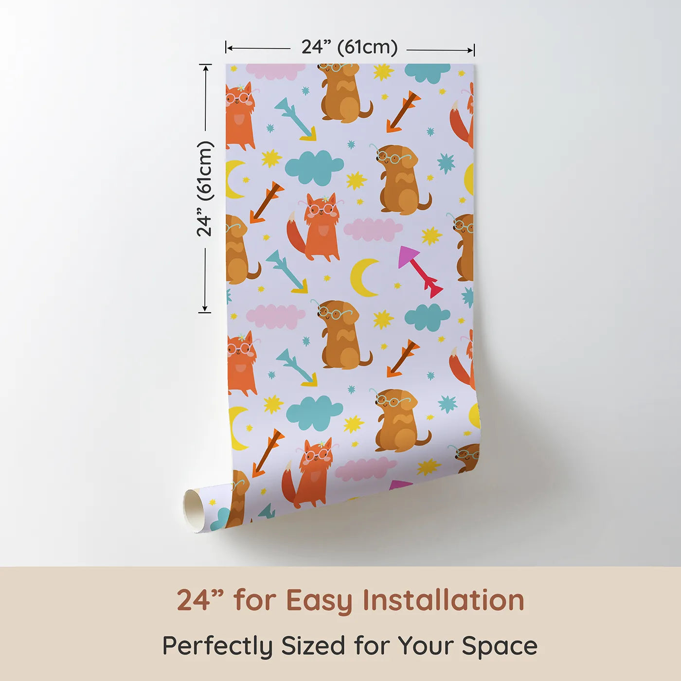 Spark your little one's imagination with this charming animal wallpaper. Friendly foxes and dogs, wearing cute glasses, are scattered among moons, stars, and playful arrows on a beautiful lavender background. It's a sweet and imaginative scene for any nursery or playroom.