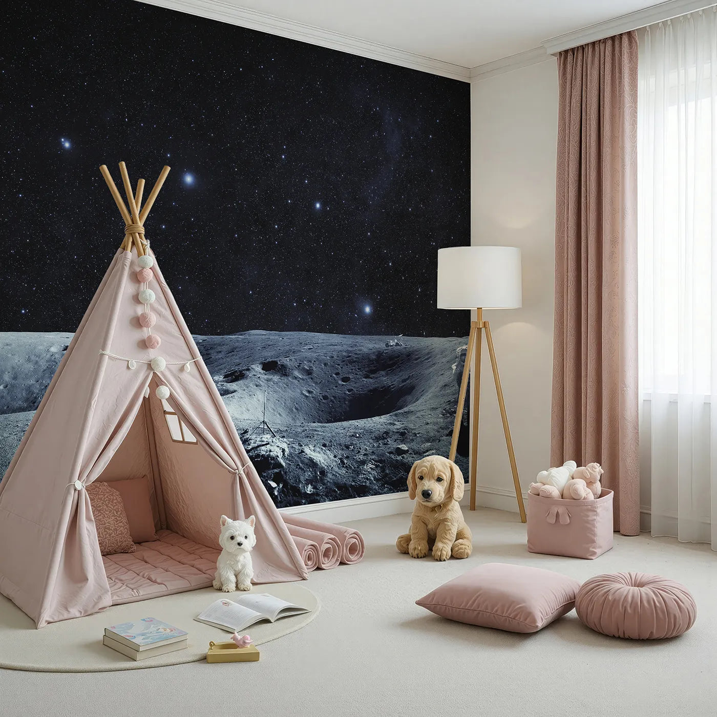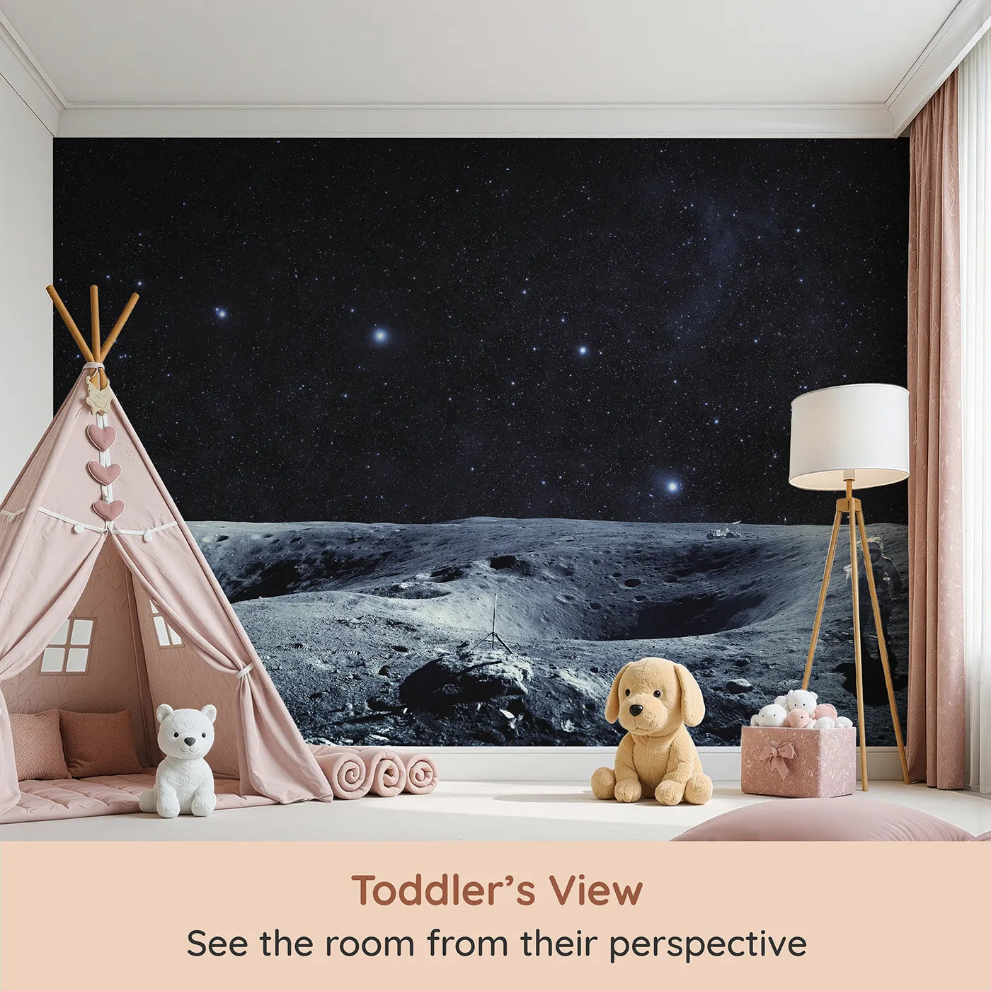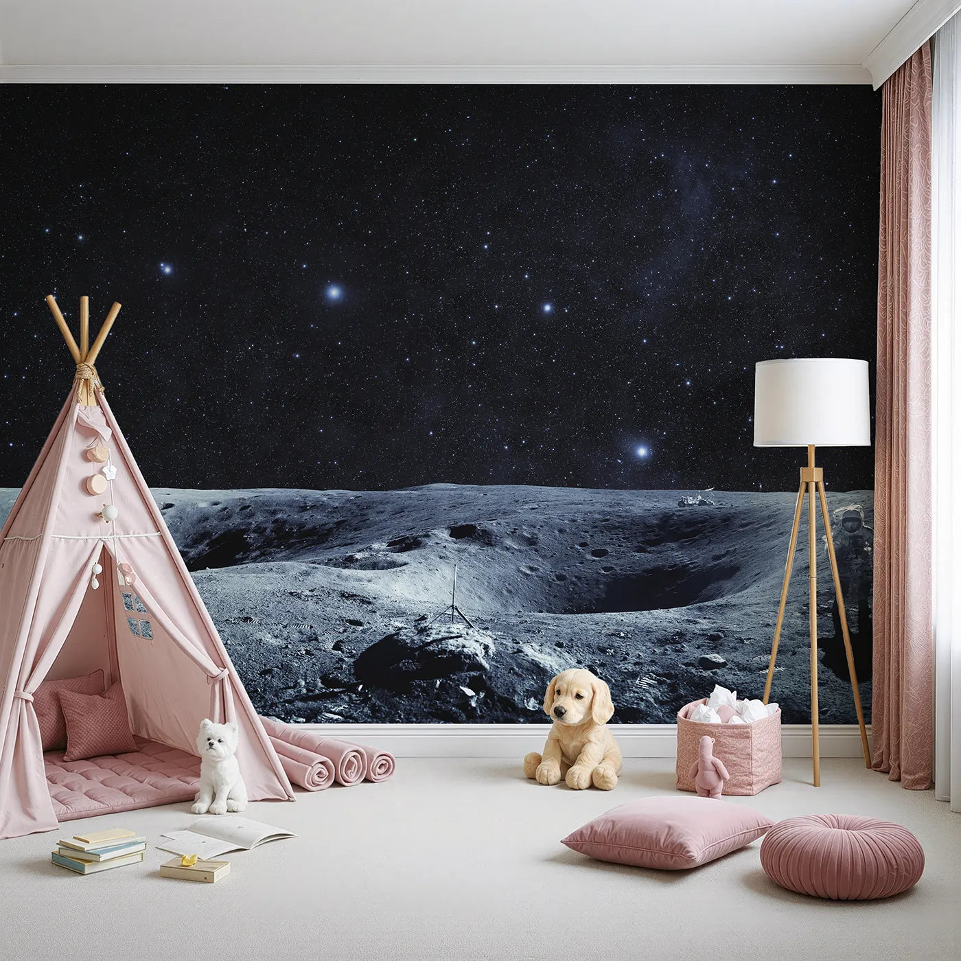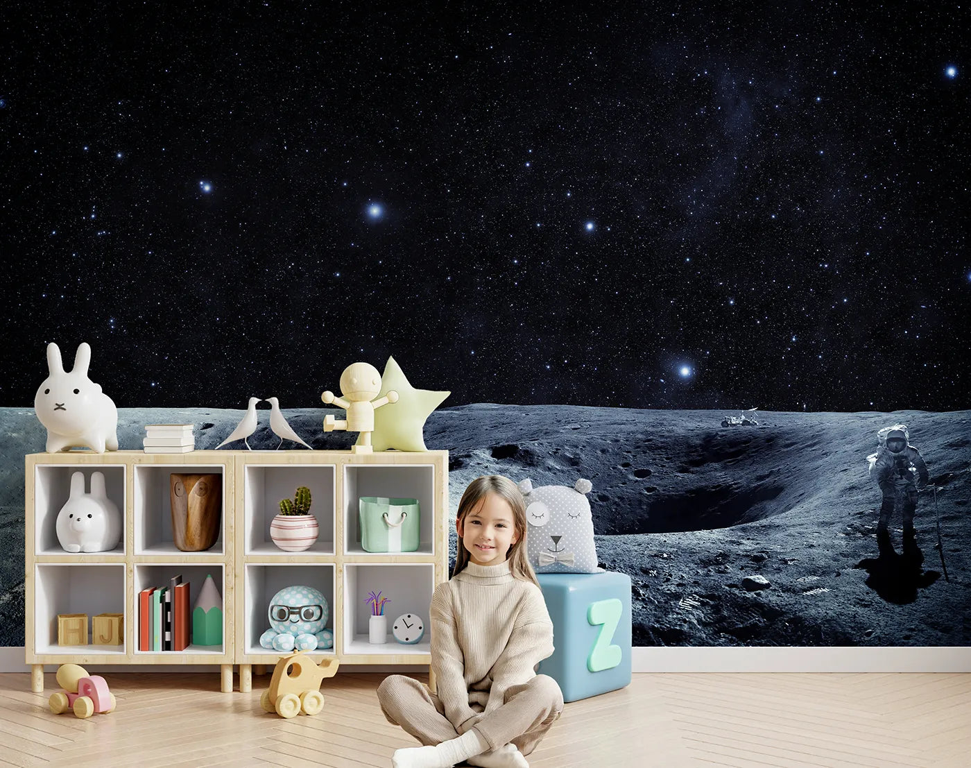 Spark your little one's curiosity with this breathtakingly realistic wall mural. A lone astronaut stands on the surface of the Moon, with the vast, starry expanse of space behind them. This high-resolution image captures the quiet majesty of space exploration in incredible detail.