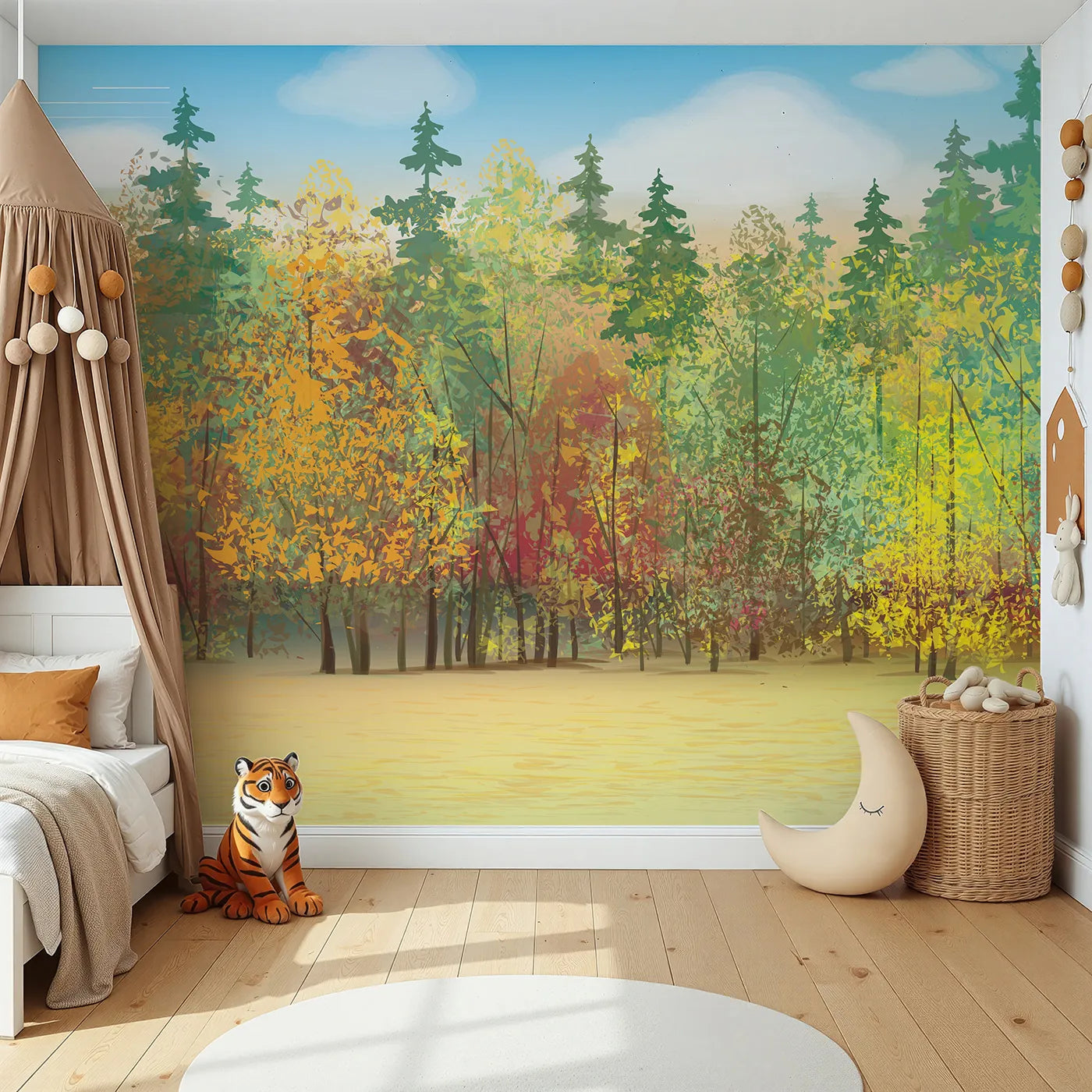 This stunning scenic wall mural captures the breathtaking beauty of an autumn forest. A panoramic view of trees in vibrant shades of yellow, orange, and green creates a warm, immersive, and joyful atmosphere. It's like taking a walk in the woods on a perfect fall day.