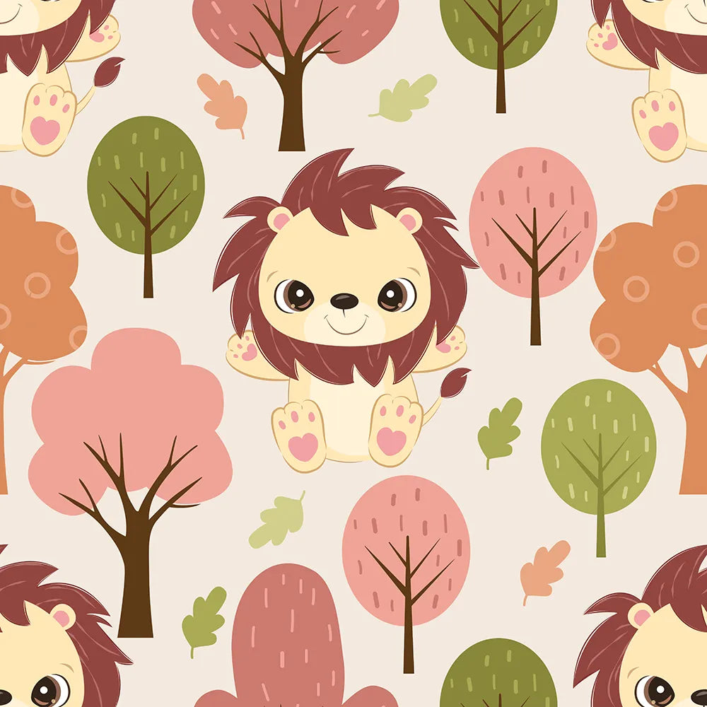 This charming animal wallpaper creates a warm and scenic woodland setting for your little one. Cute, smiling lions are nestled among stylized trees in gentle shades of beige, pink, and green, evoking a cozy autumn day. It's a wonderful design for sparking imaginative play and creating a reassuring atmosphere.