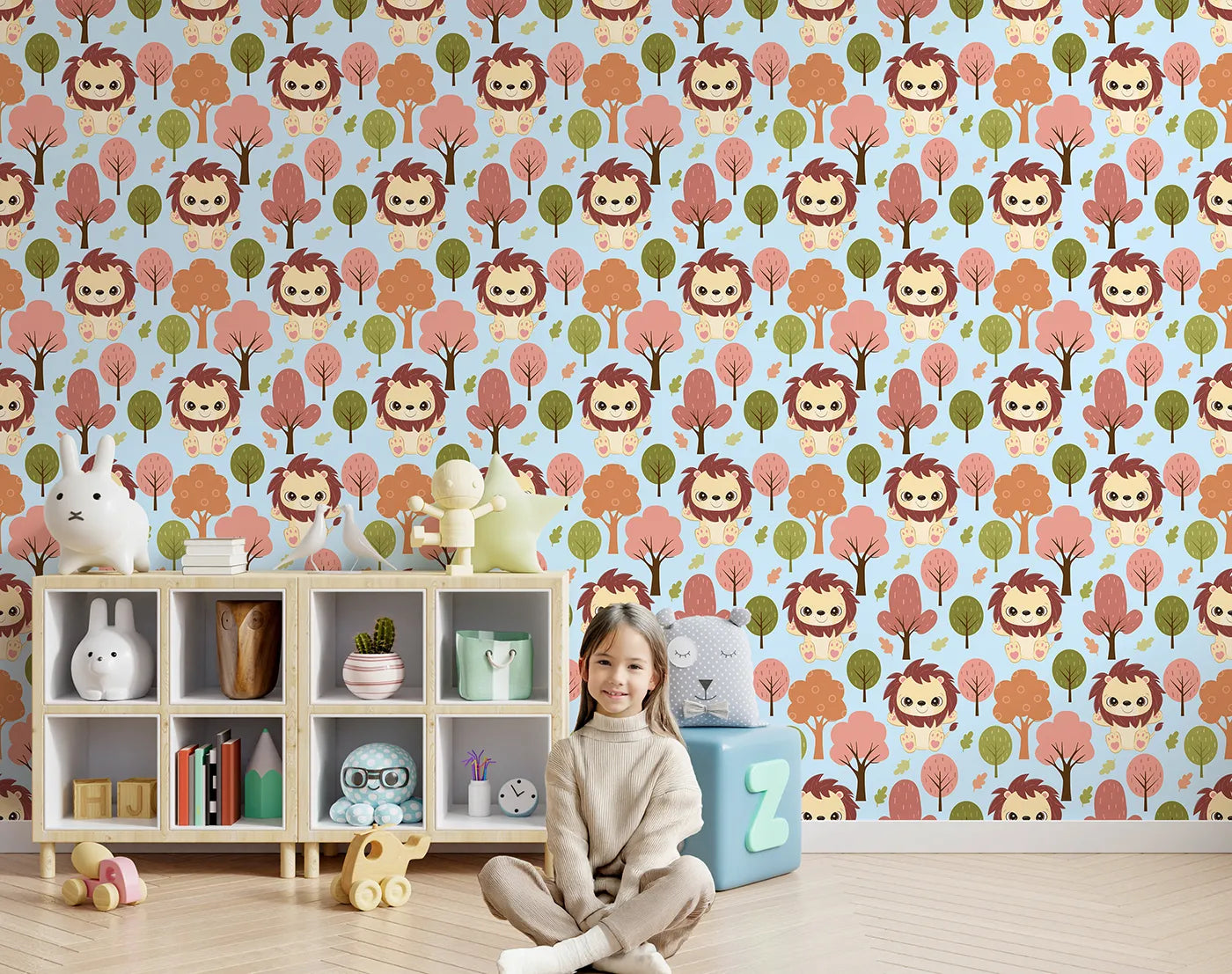 Let them wander through a calm, enchanting forest with this beautiful animal wallpaper. Set on a soft blue background, this design features sweet lions surrounded by colorful autumn trees. It creates a soothing yet playful scene, ideal for a nursery accent wall or a calming toddler room.