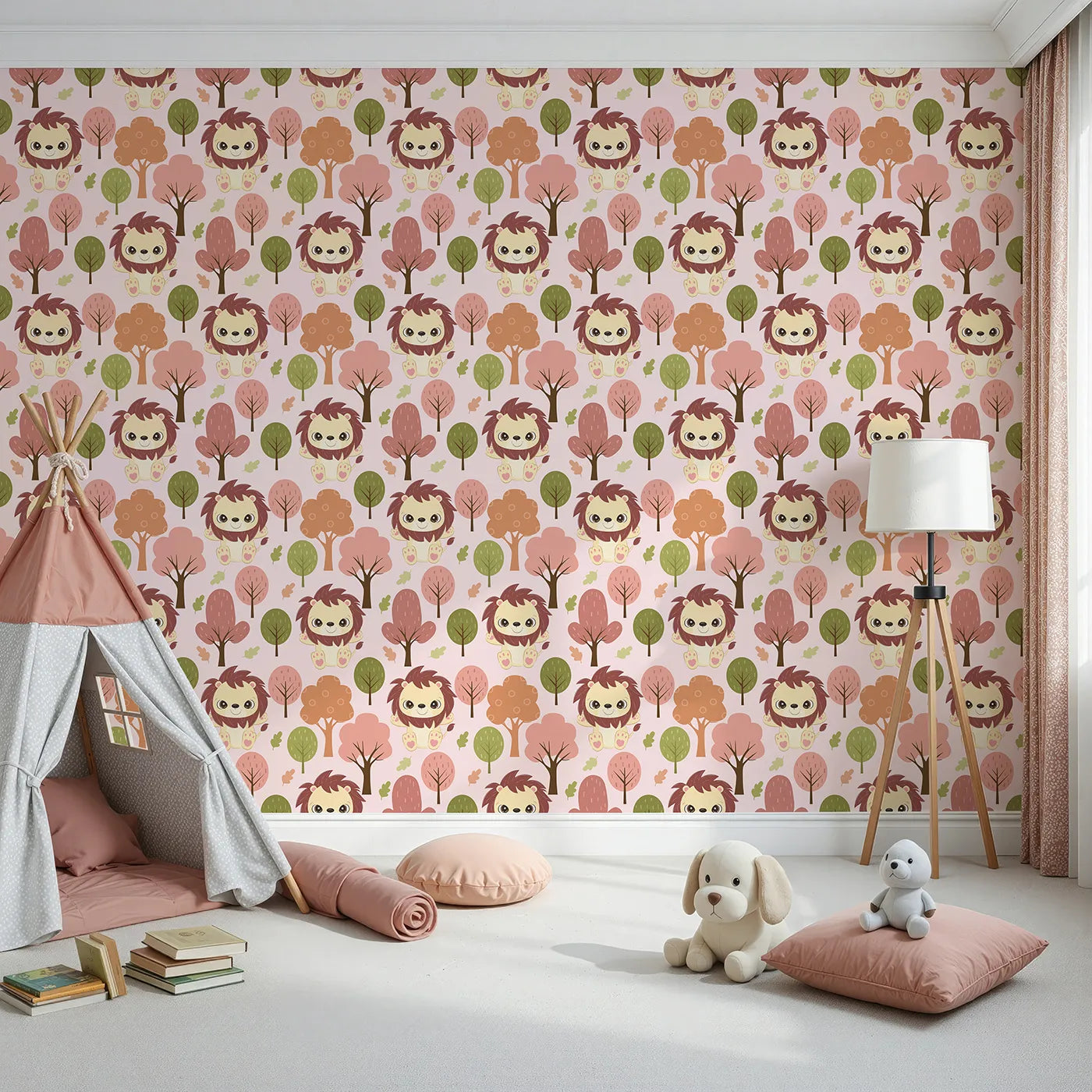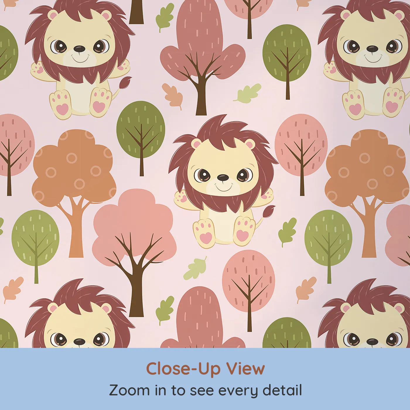 Spark your little one's imagination with this sweet lion wallpaper. Set against a soft pink backdrop, cute lions sit among a forest of whimsical trees in earthy tones. This design brings a playful, nature-inspired feeling to a nursery or toddler room, creating a perfect space for make-believe adventures.