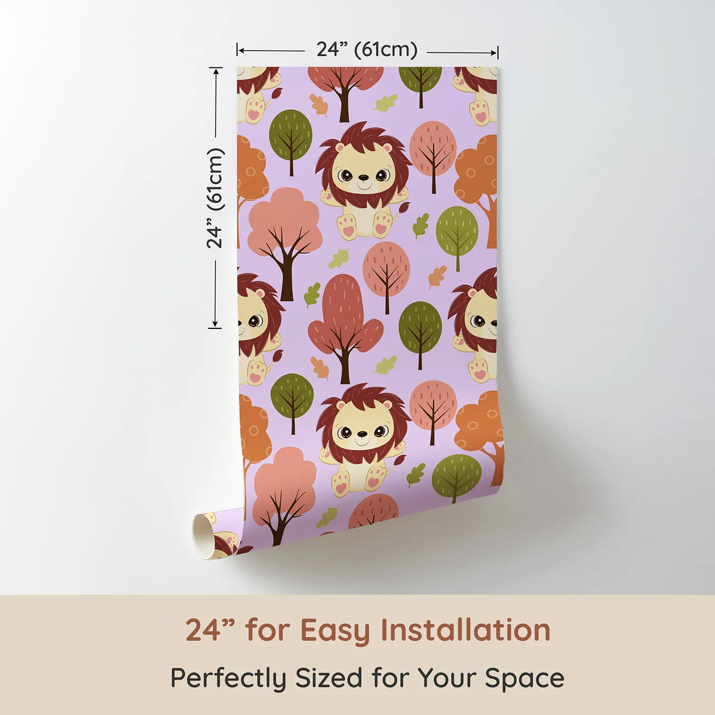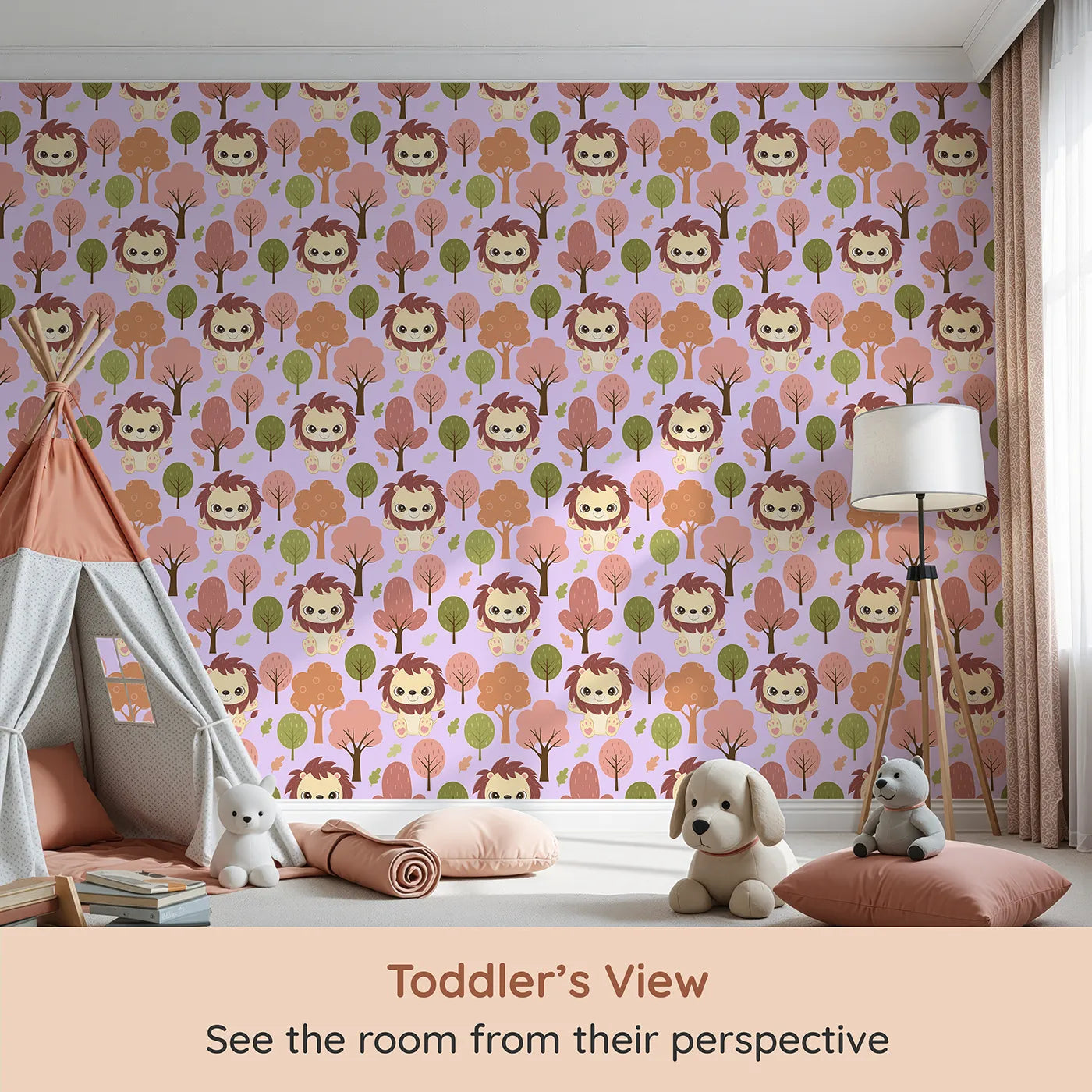 This enchanting kids wallpaper features cute lions in a dreamy forest of purple, pink, and orange trees. The unique and imaginative color palette makes it a standout choice for a creative playroom or a special nursery, setting the scene for fairy tales and magical adventures.