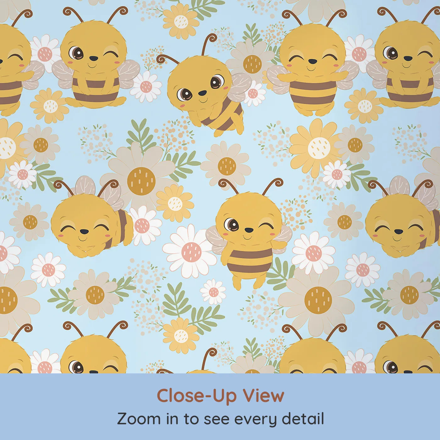 This sweet animal wallpaper brings a playful outdoor scene right into your child's room. Friendly, smiling bees buzz happily through a field of white and yellow daisies, all set against a calming sky-blue background. It's a joyful and airy design that sparks curiosity and imaginative play.
