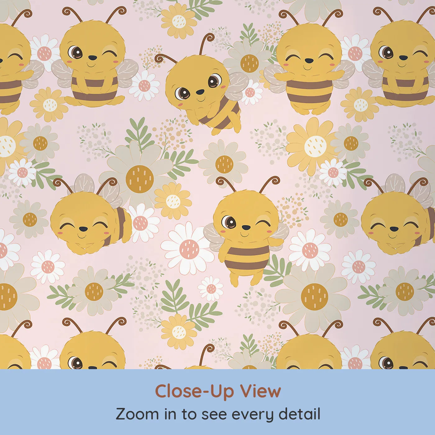 This charming kids wallpaper features a delightful scene of cute, smiling bees buzzing amongst a field of daisies and wildflowers. The soft pink background gives this nature wallpaper a warm and gentle feel, perfect for creating a cozy and imaginative nursery or playroom for your little one.