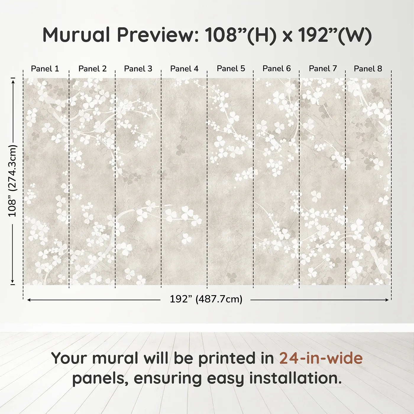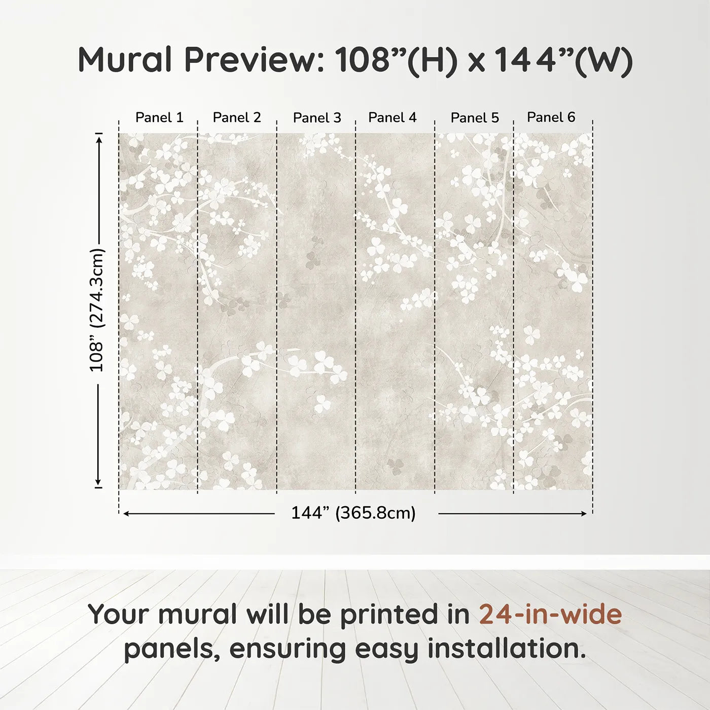 This beautiful and serene floral wall mural features delicate branches of white blossoms against a soft, textured beige background. The minimalist, elegant style creates a peaceful and sophisticated atmosphere, perfect for a calming, modern nursery or child's room.