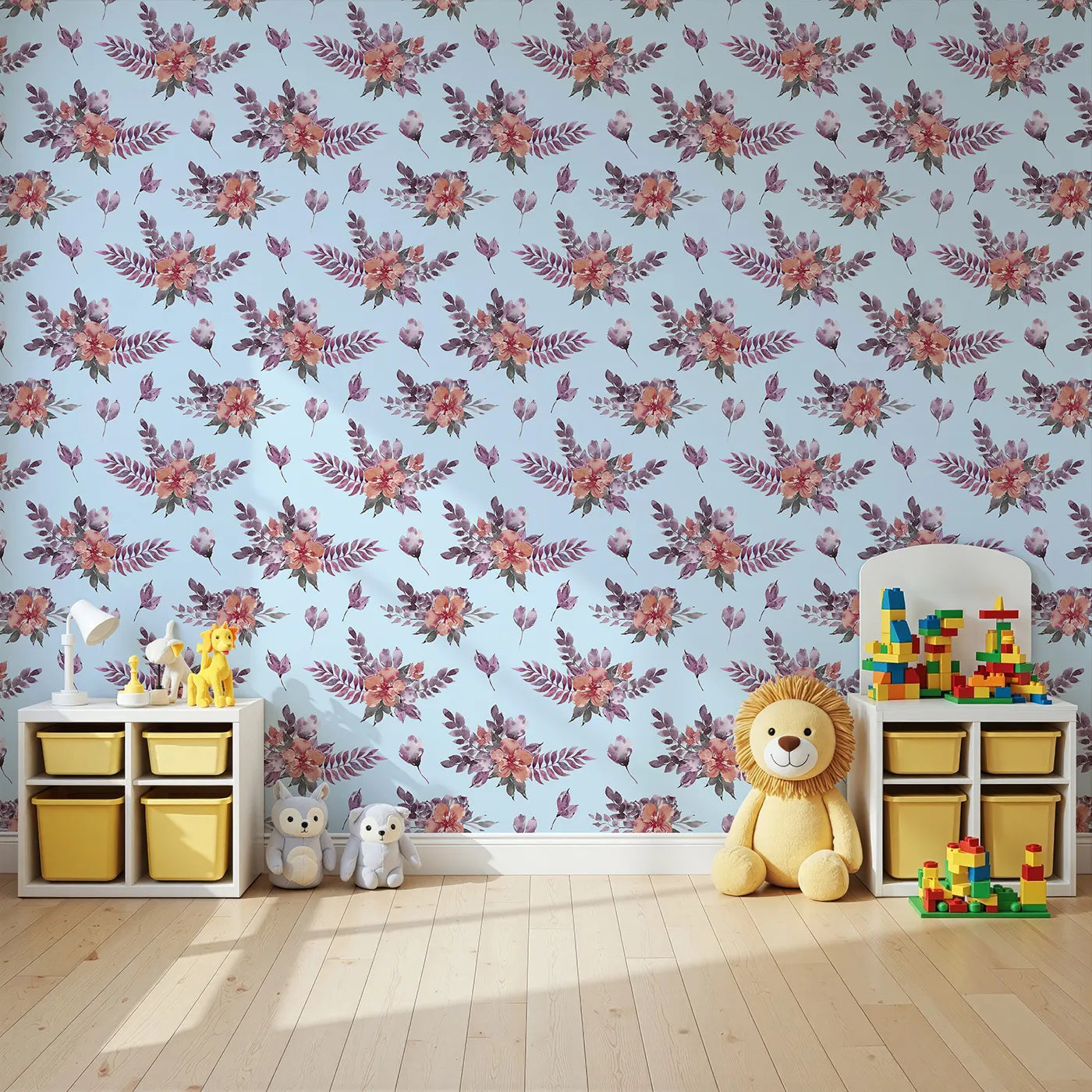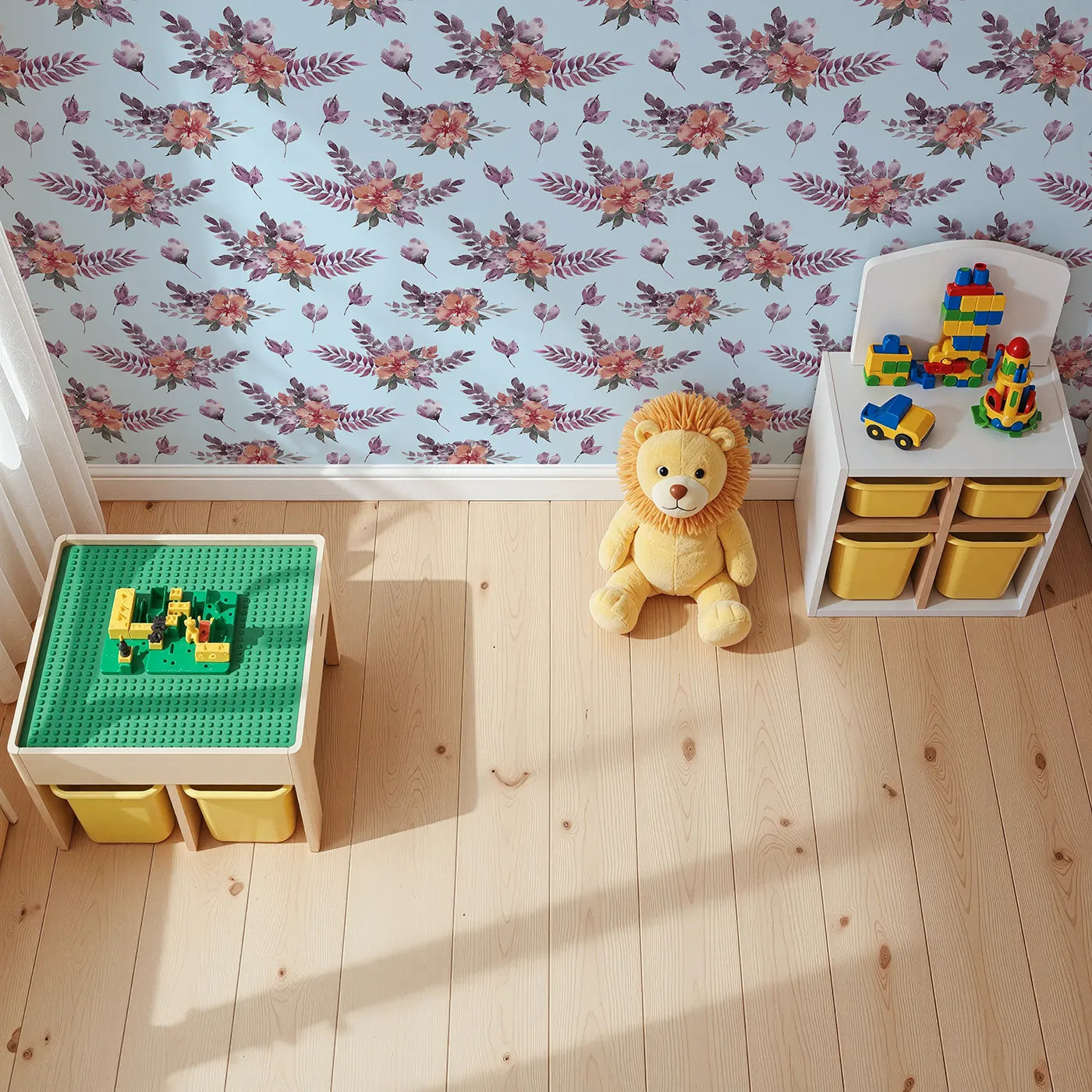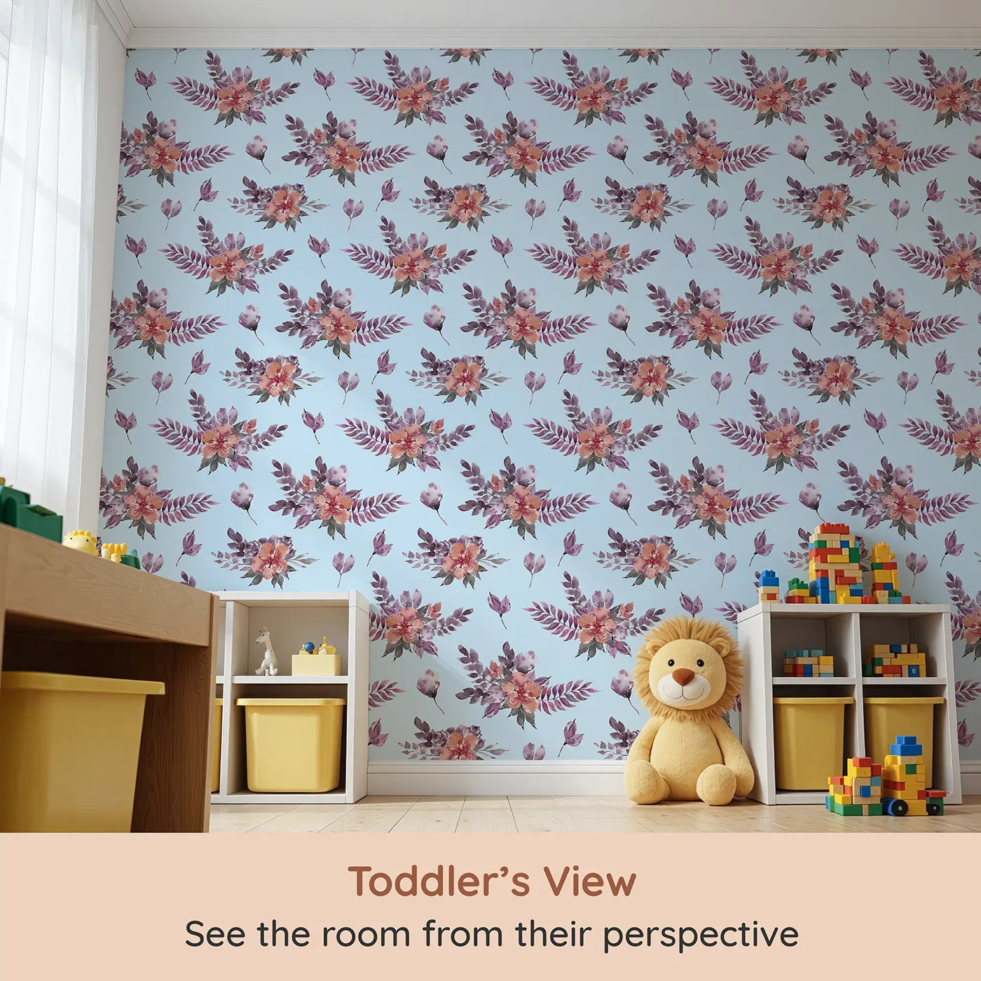 This beautiful flower wallpaper brings a meadow's gentle charm into your little one's room. On a calm sky blue background, delicate watercolor wildflowers in soft purples and oranges are scattered across the wall, creating a dreamy and artistic feel. The design is perfect for a nursery that will grow with your child.