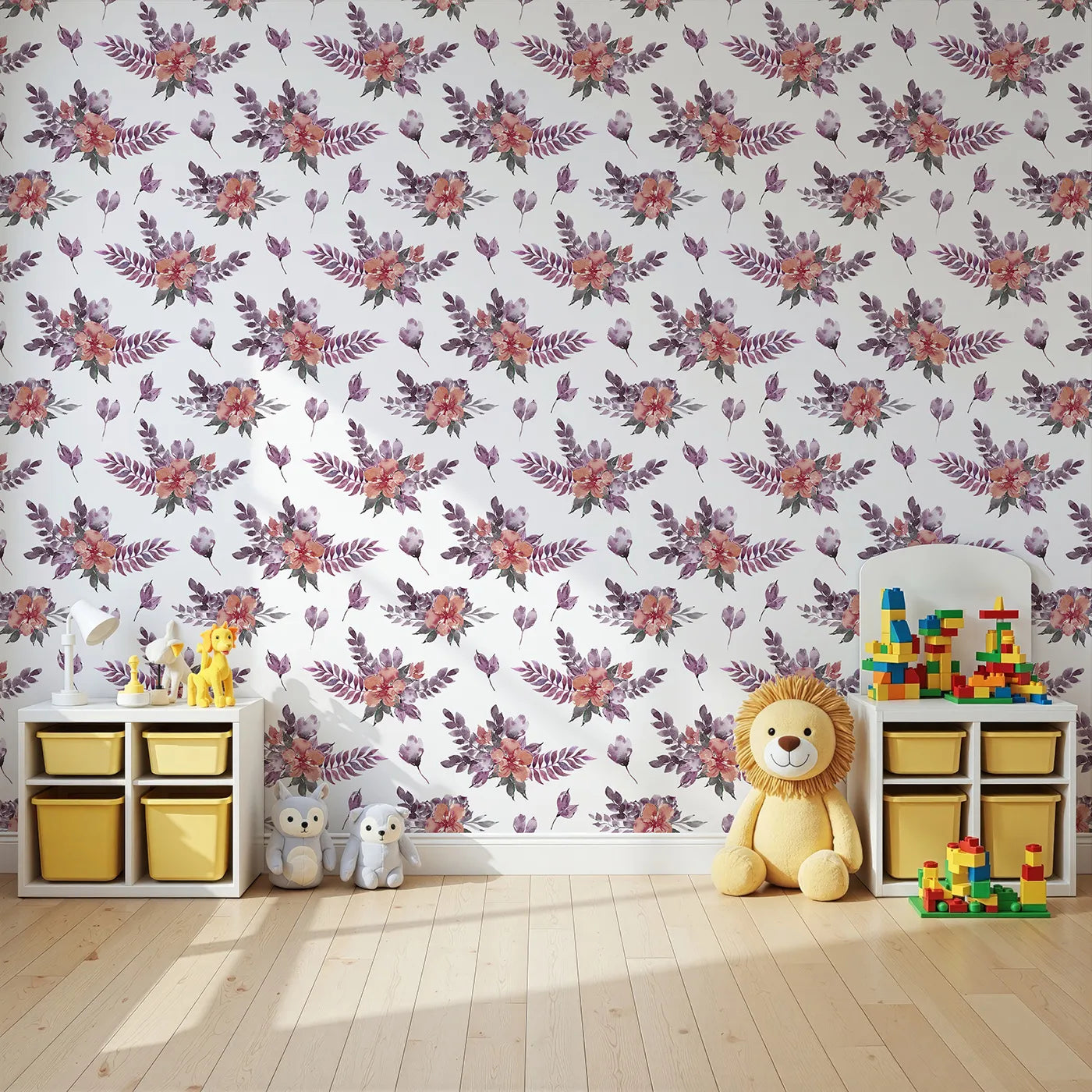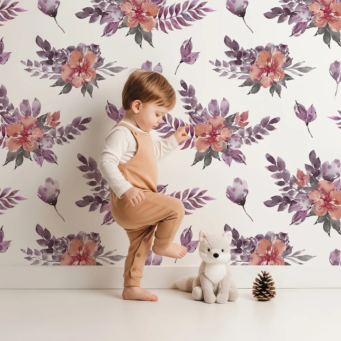 This beautiful flower wallpaper brings a meadow's gentle charm into your little one's room. Delicate watercolor wildflowers in soft purples and oranges are scattered across the wall, creating a dreamy and artistic feel. The design is both playful and serene, perfect for a nursery that will grow with your child.