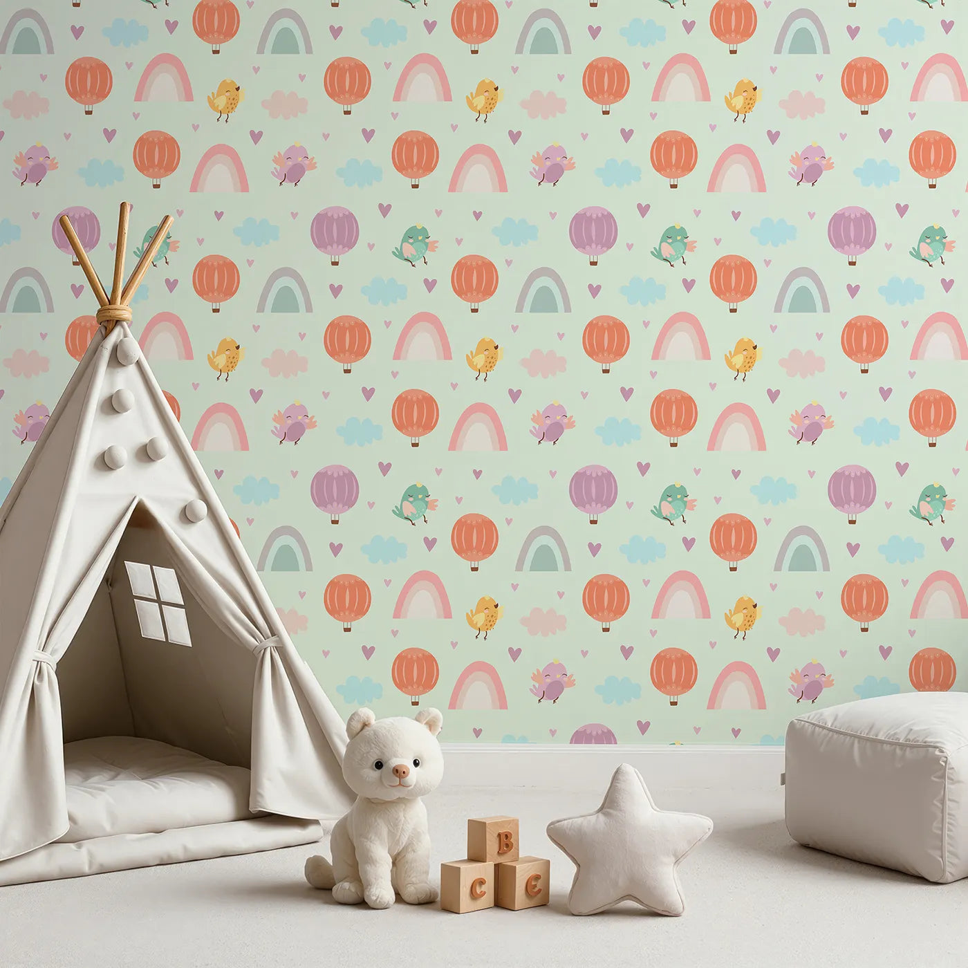 This sweet kids wallpaper features a whimsical parade of cute birds, pastel rainbows, and gentle hot air balloons against a mint green sky. Sprinkled with clouds and hearts, this dreamy design creates a joyful and imaginative atmosphere, perfect for a nursery or playroom where sweet stories take flight.
