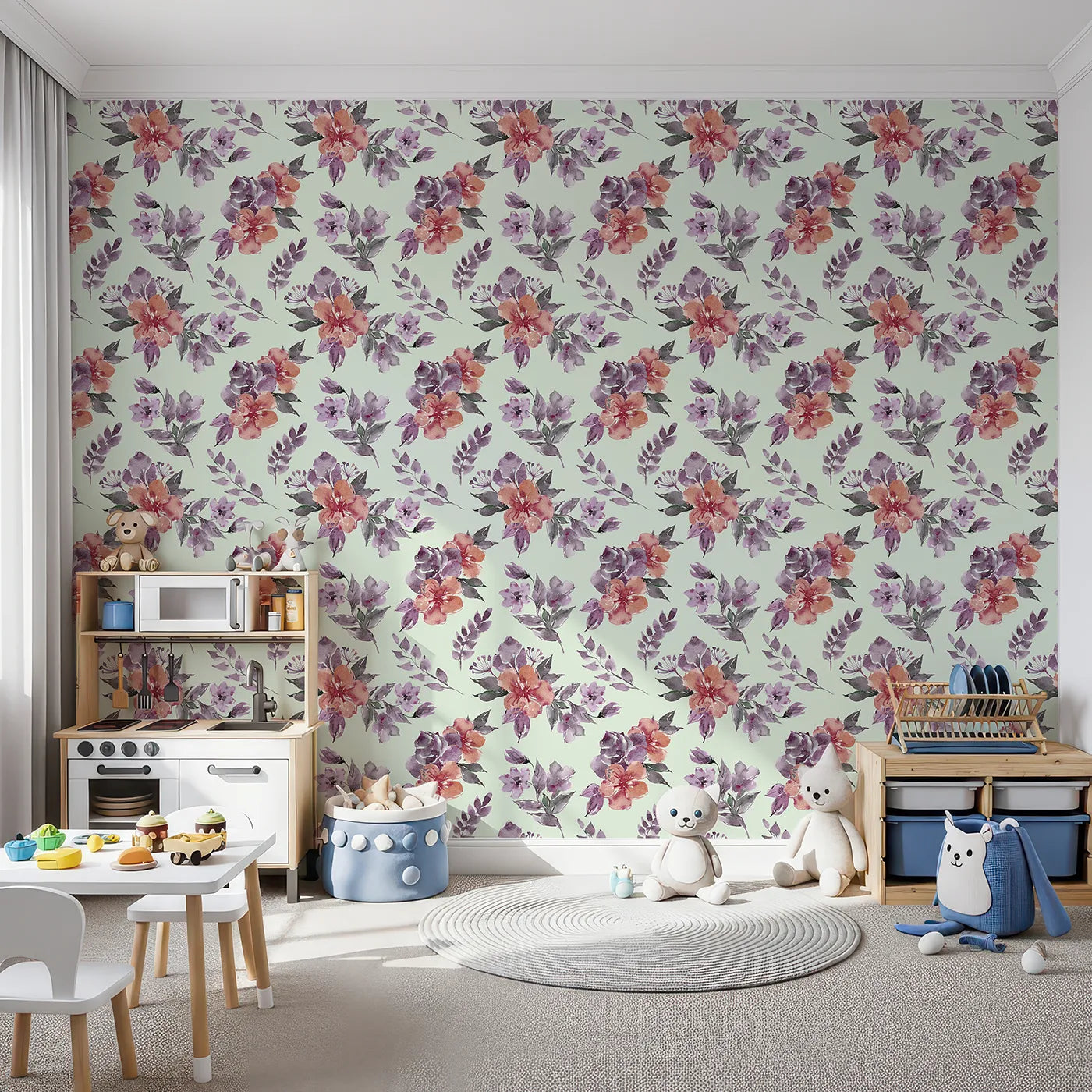 This charming floral wallpaper features a beautiful harmony of watercolor blossoms on a fresh mint green background. The shades of blush, purple, and orange create a dreamy and romantic atmosphere, perfect for a nursery or a sophisticated playroom. The delicate leaves and flowers seem to float on the wall.