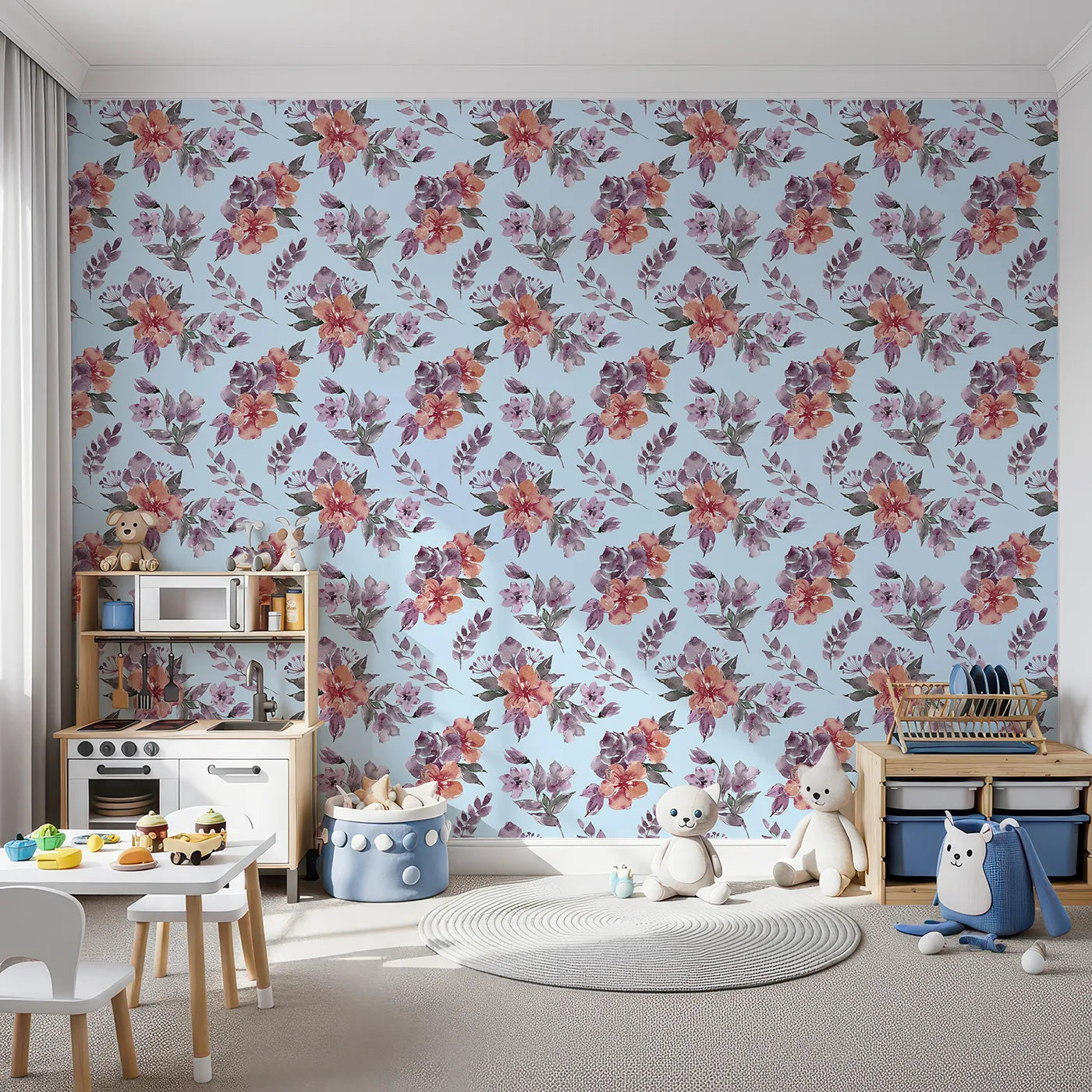 This charming floral wallpaper features a beautiful harmony of watercolor blossoms on a calm sky blue background. The shades of blush, purple, and orange create a dreamy and romantic atmosphere, perfect for a nursery or a sophisticated playroom. The delicate leaves and flowers seem to float on the wall.