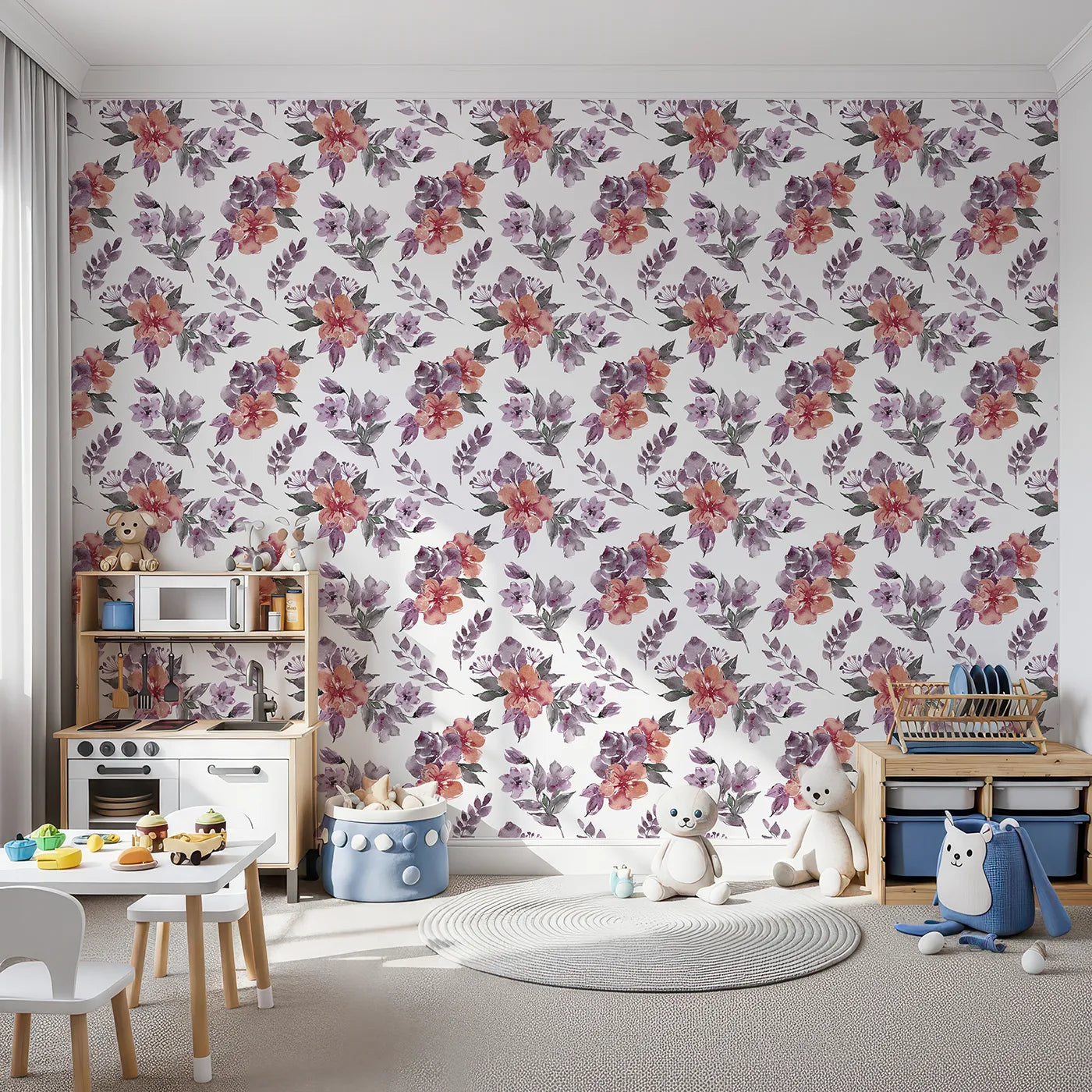 This charming floral wallpaper features a beautiful harmony of watercolor blossoms in shades of blush, purple, and orange. The soft, painterly style creates a dreamy and romantic atmosphere, perfect for a little girl's nursery or a sophisticated playroom. The delicate leaves and flowers seem to float on the wall.