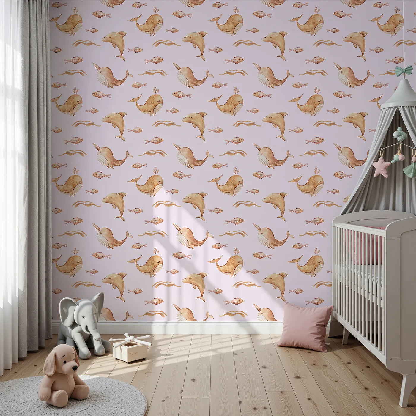 This charming ocean wallpaper showcases a sweet collection of sea creatures in soft, blush tones. Gentle whales, narwhals, and dolphins drift peacefully on a blush pink background, creating a warm and dreamy atmosphere perfect for a nursery or a toddler's first bedroom.