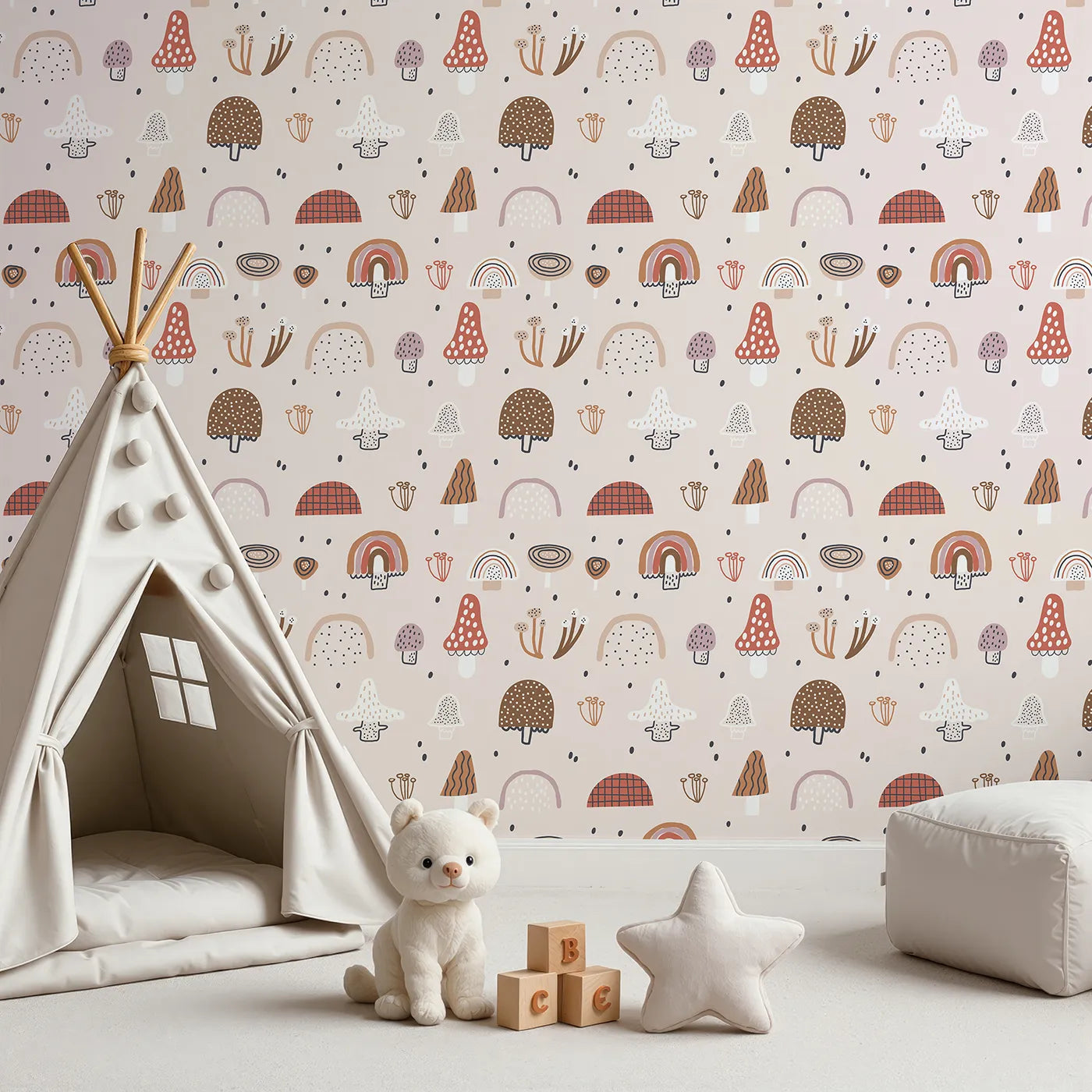 Boho Mushroom Rainbow Wallpaper - A Whimsical Meadow for Little Foragers