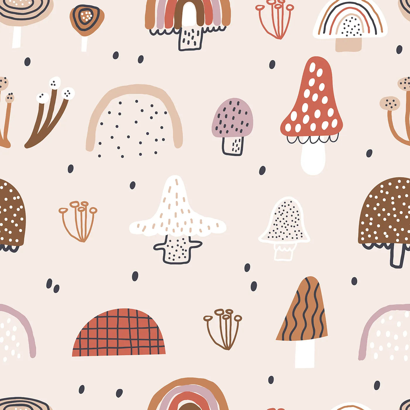 This charming nursery wallpaper features a sweet pattern of whimsical mushrooms and earthy rainbows in a warm, gentle color palette. The hand-drawn, boho style creates a cozy and imaginative atmosphere, perfect for a calming space where your little one can dream and grow. It's a modern yet timeless choice for a gender-neutral nursery.