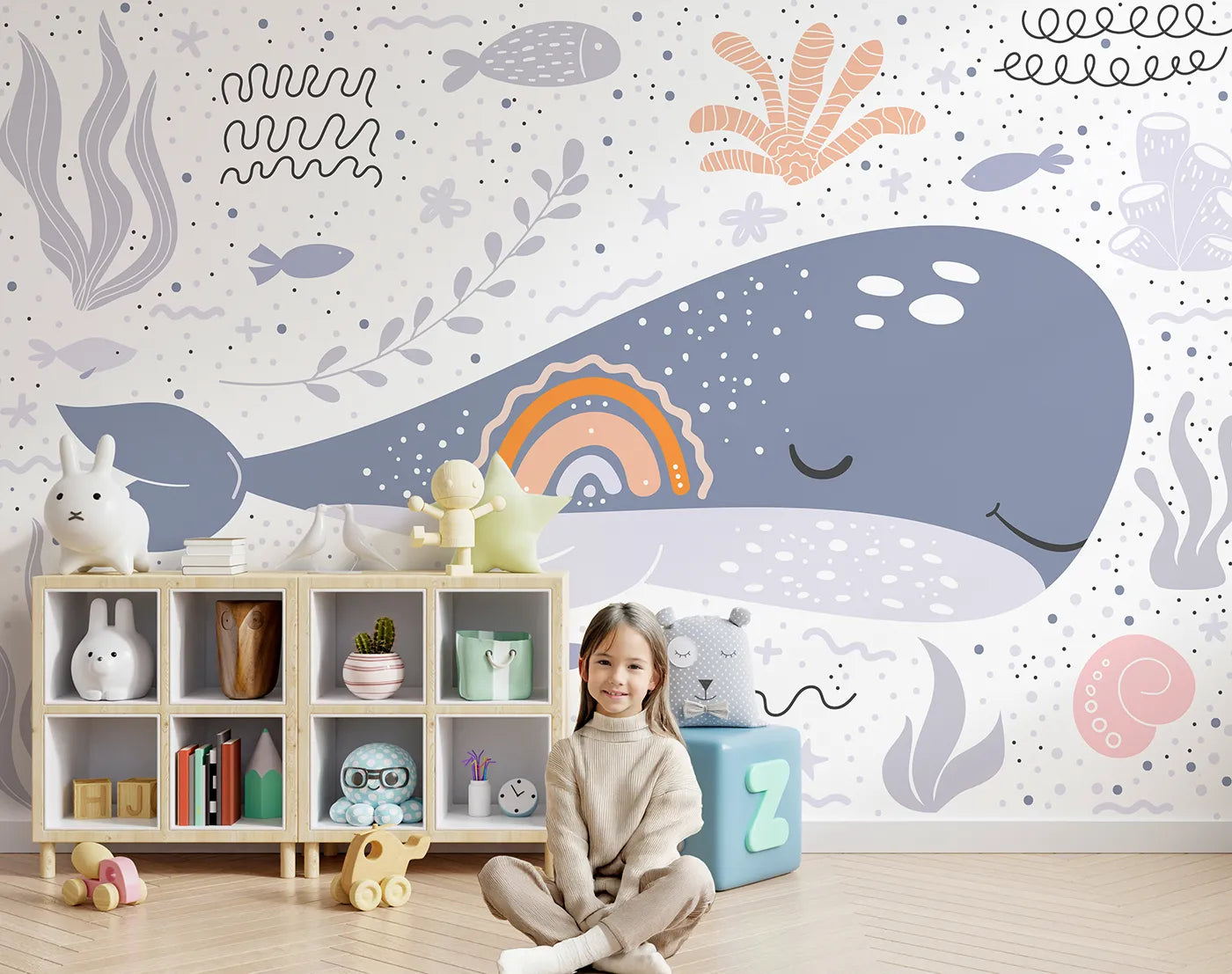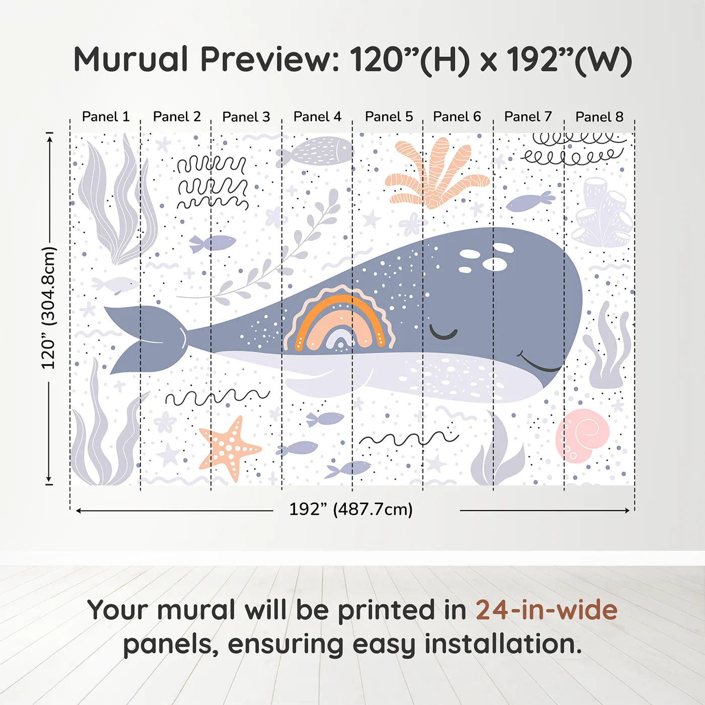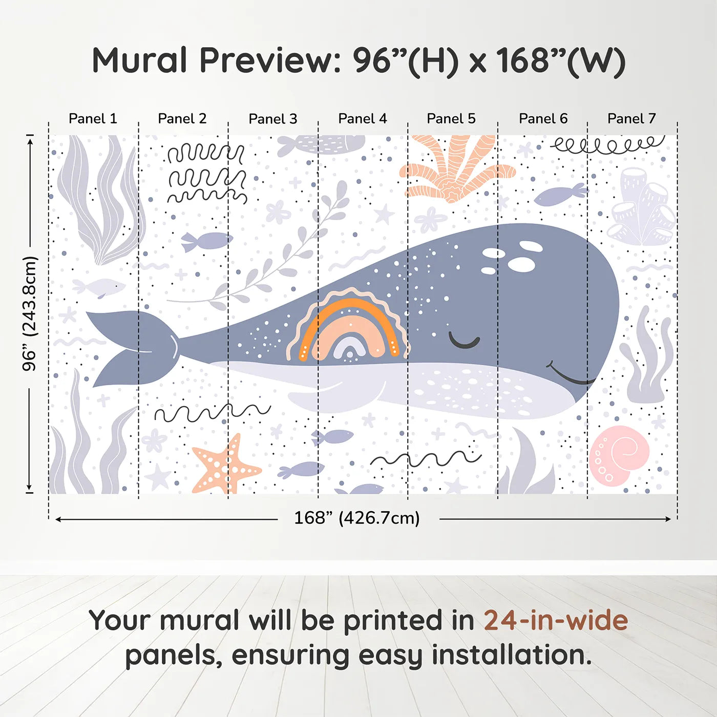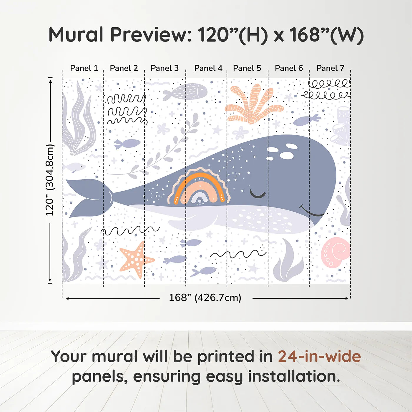 Boho Rainbow Whale Wall Mural - A Dreamy Ocean Friend for Your Little Sprout
