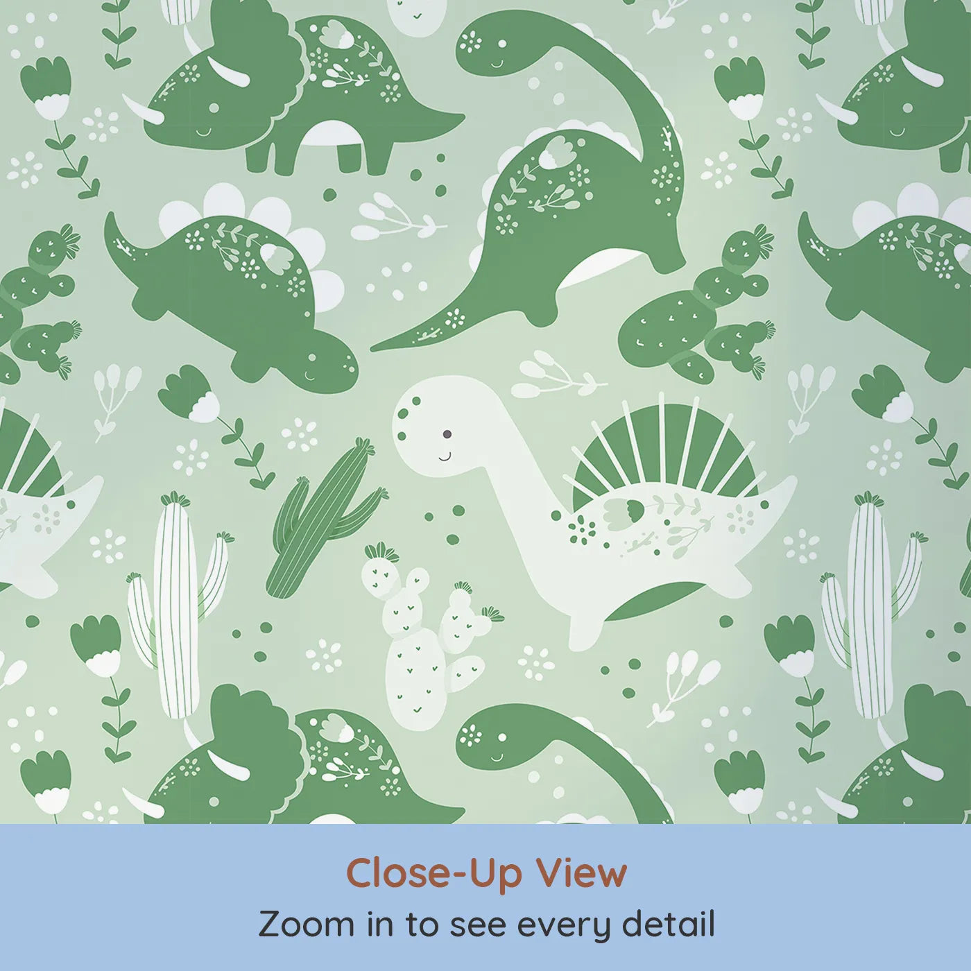 This fun kids wallpaper features a pattern of cute dinosaurs decorated with flowers among colorful cacti on a refreshing sage green background. The bright and happy design is perfect for a gender-neutral nursery or a playful toddler room, creating a space that feels both lively and connected to nature.