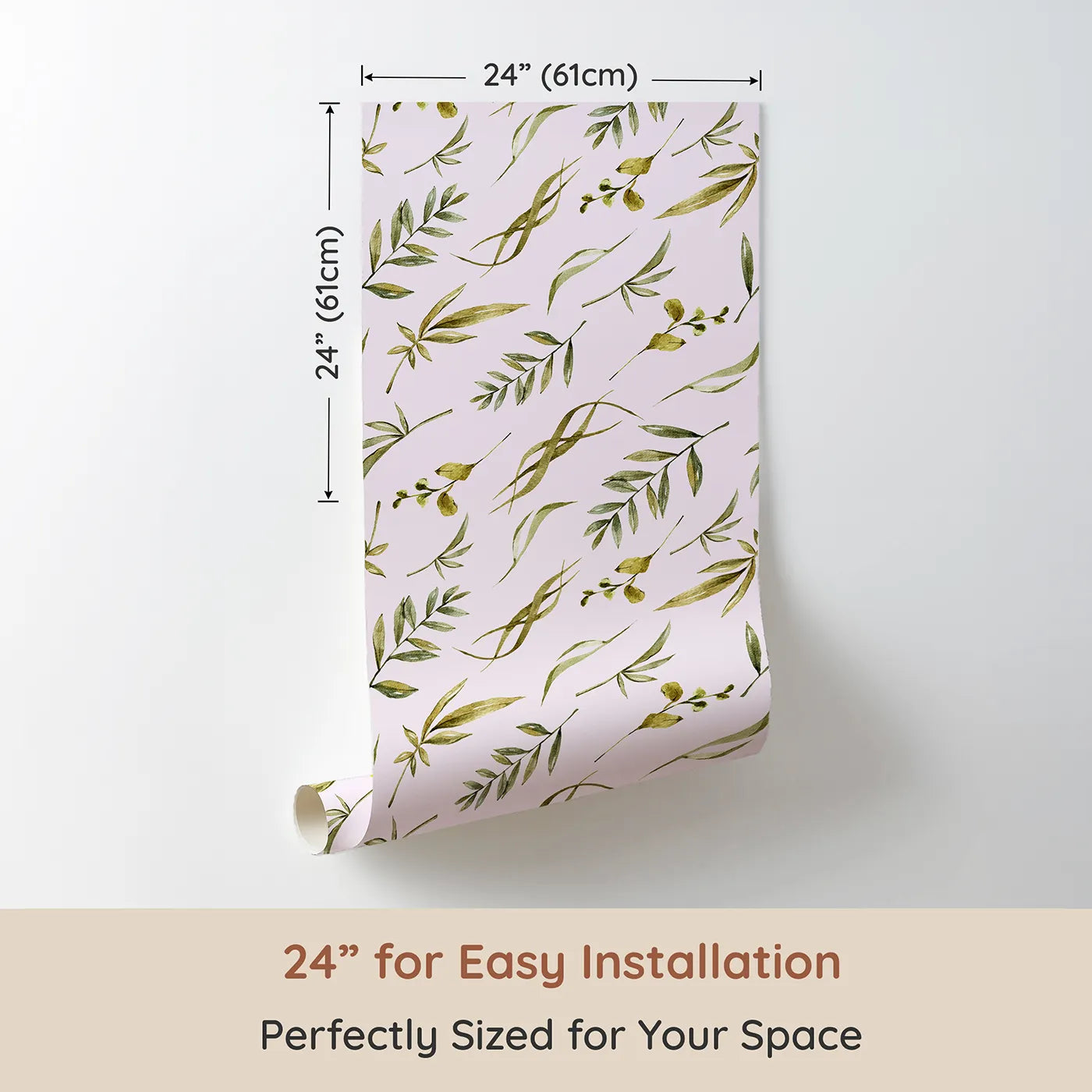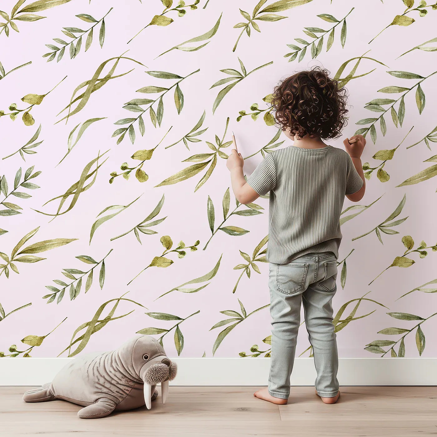 This charming botanical wallpaper brings a fresh, airy feeling to any room. It features a simple pattern of delicate watercolor leaves on a soft blush pink background, creating a serene and warm atmosphere. The minimalist design is modern and versatile, perfect for a sweet nursery or a peaceful playroom.