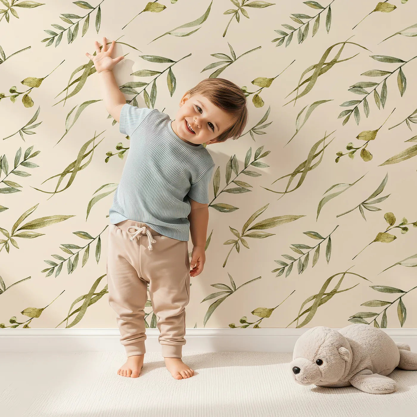 This charming botanical wallpaper brings a fresh, airy feeling to any room. It features a simple pattern of delicate watercolor leaves on a warm cream background, creating a serene and calming atmosphere. The minimalist design is modern and versatile, perfect for a gender-neutral nursery or a peaceful playroom.