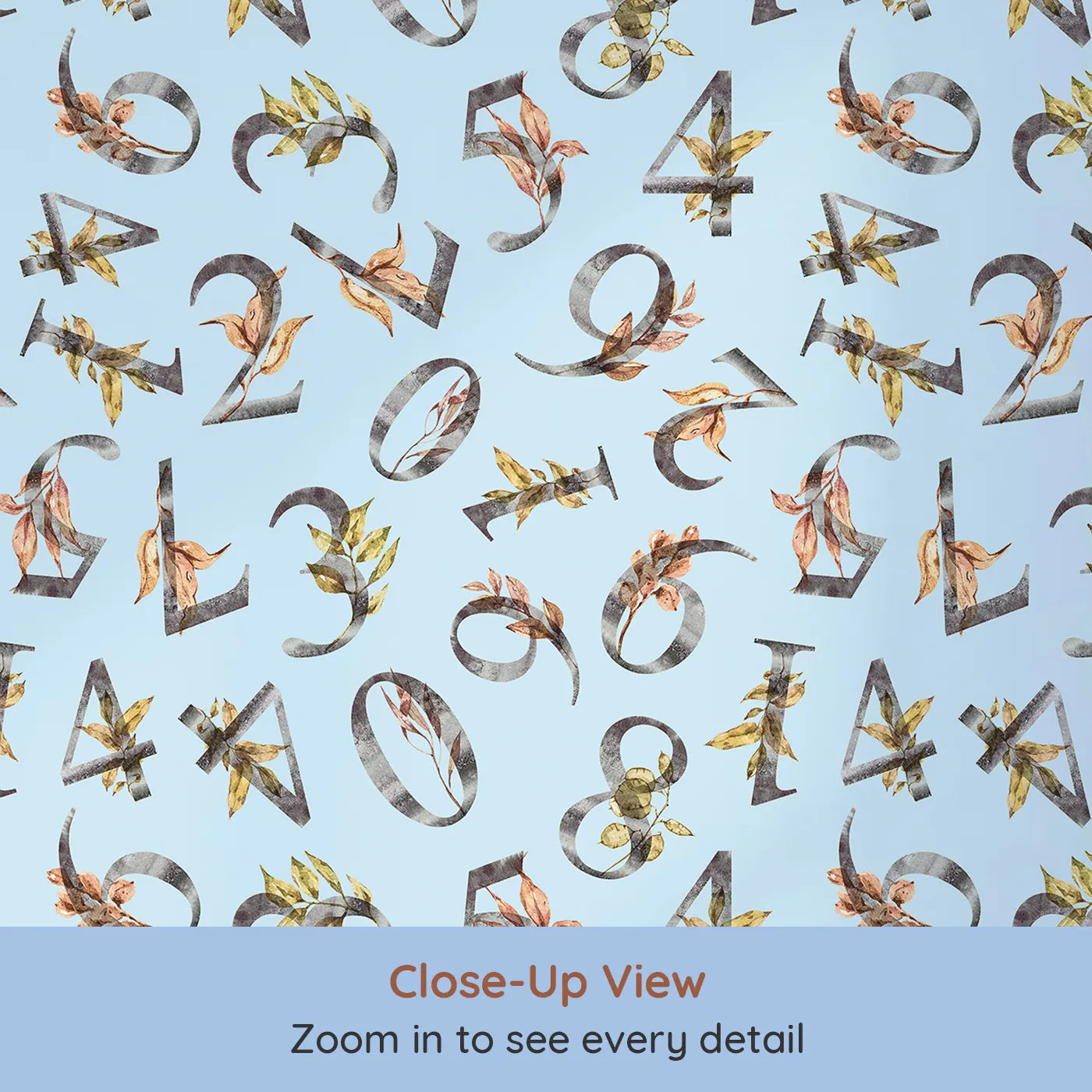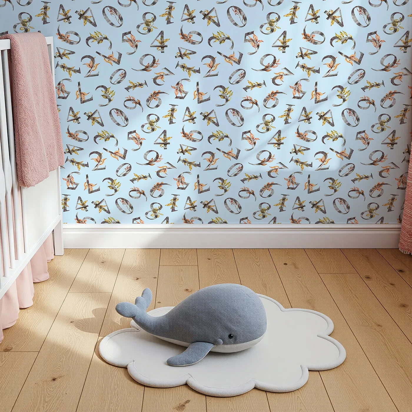 This charming educational wallpaper offers a stylish way to introduce your little one to numbers. Each numeral, from zero to nine, is gracefully adorned with delicate watercolor leaves and botanicals. Set against a blue background, this design is both a fun learning tool and a chic piece of decor.