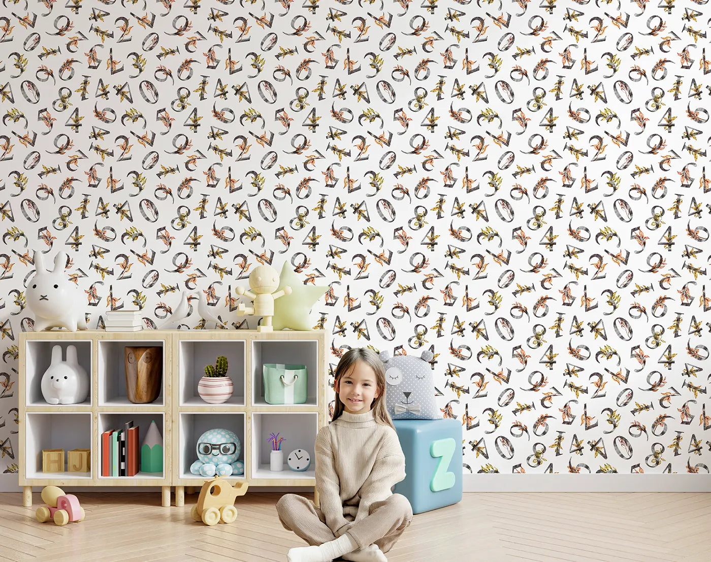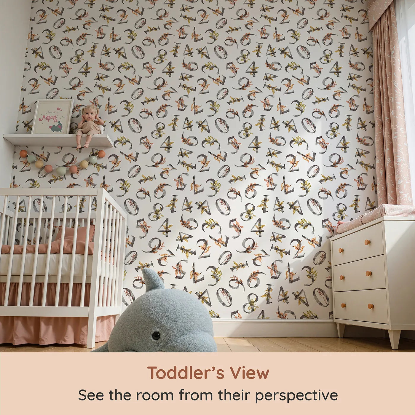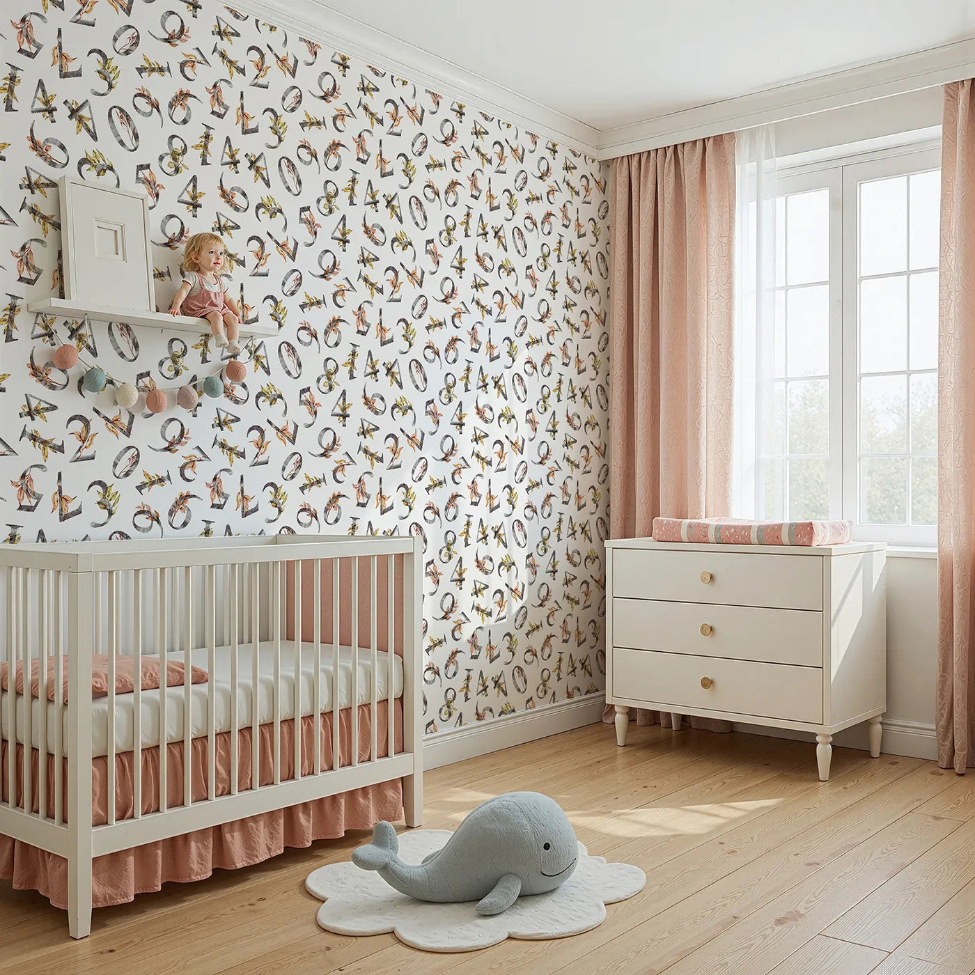 This charming educational wallpaper offers a stylish way to introduce your little one to numbers. Each numeral, from zero to nine, is gracefully adorned with delicate watercolor leaves and botanicals. Set against a clean white background, this design is both a fun learning tool and a chic piece of decor.