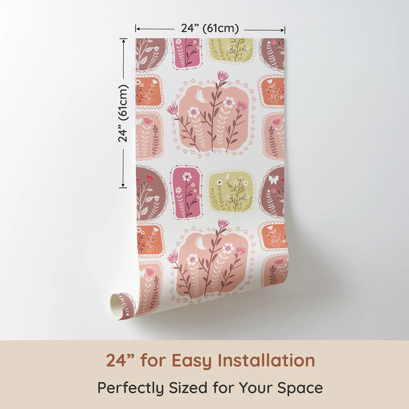 This charming kids wallpaper features a delightful patchwork of framed floral scenes. Each patch, with its unique color and scalloped border, showcases sweet, simple flowers and butterflies, creating a look that is both whimsical and reminiscent of a cozy quilt. It's a perfect choice for a room with a touch of vintage charm.