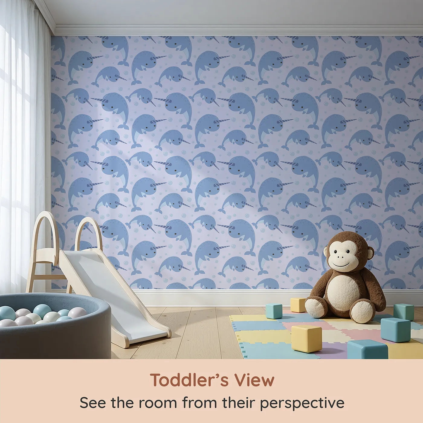 This whimsical girls wallpaper features a parade of cute blue narwhals swimming in a sea of bubbles against a dreamy lavender background. The magical color combination and sweet design create an enchanting underwater world, perfect for a nursery or bedroom that inspires fairy tales.