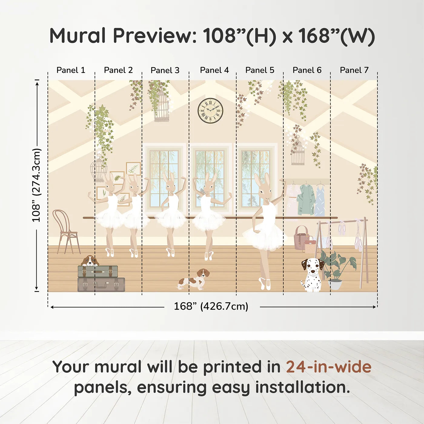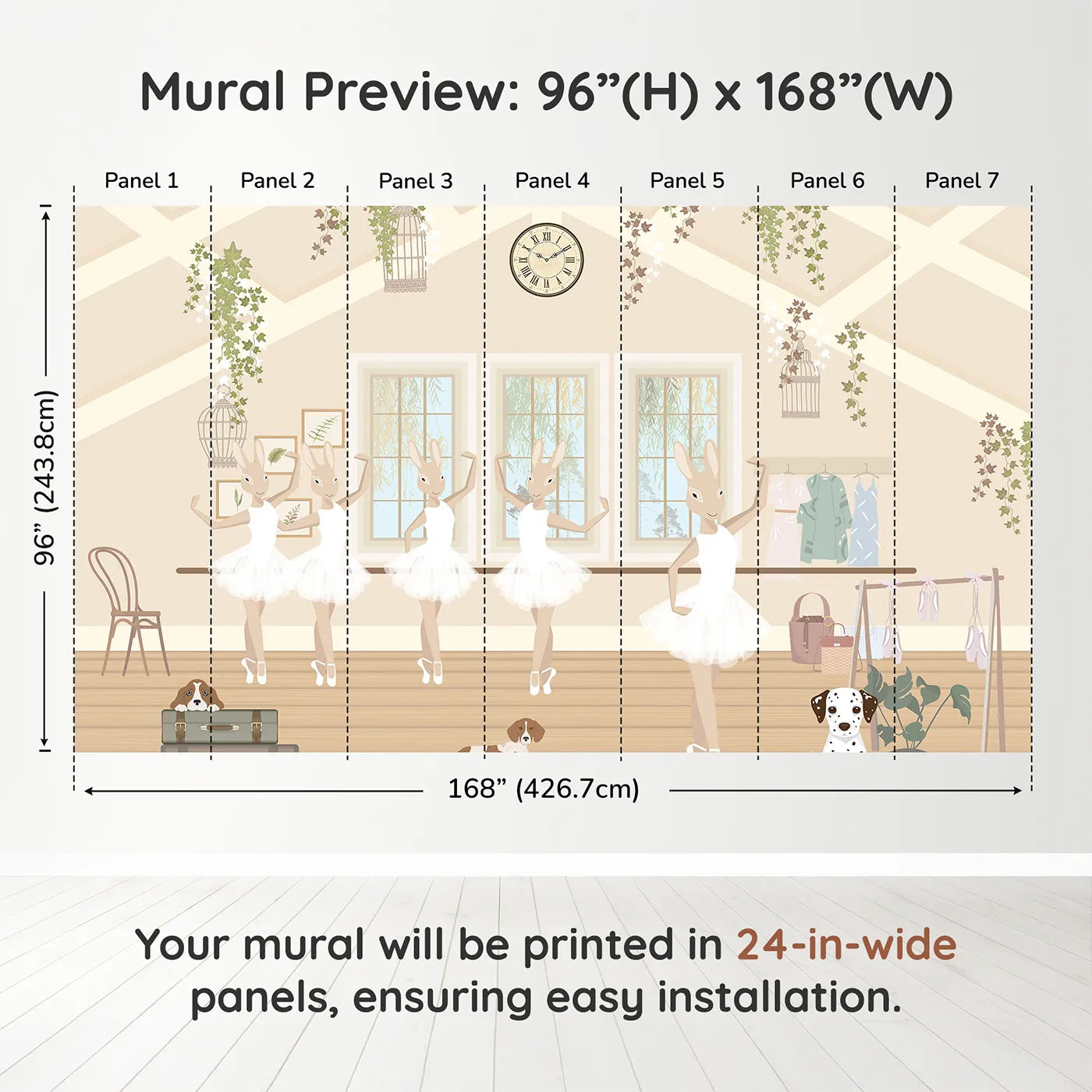 This adorable and sophisticated wall mural depicts a bunny ballet school, complete with little rabbit ballerinas in white tutus, a dance barre, and cute puppies watching from the sidelines. The soft, neutral color palette and classic illustration style create a timeless and charming scene.