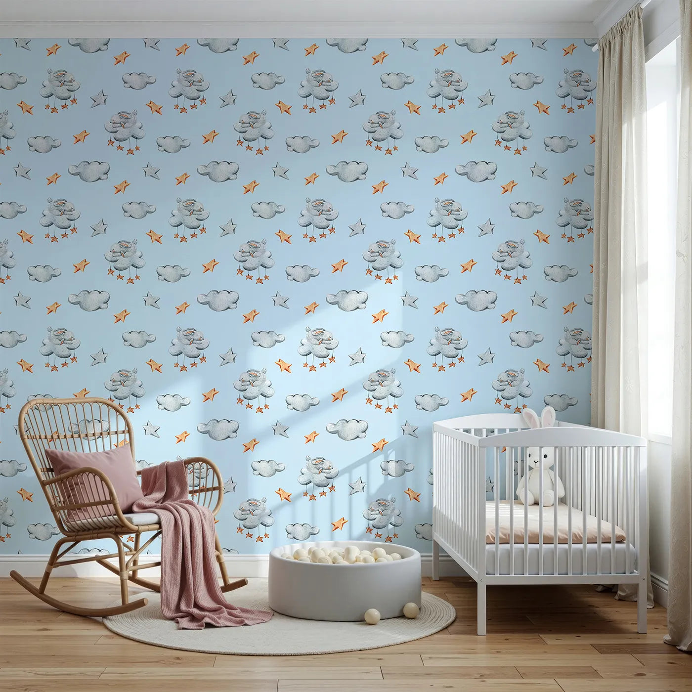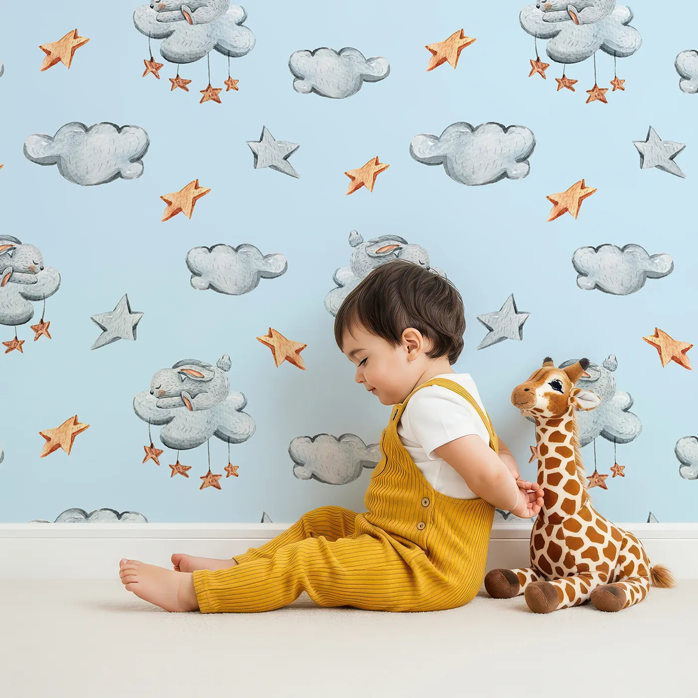 This charming nursery decor helps create a magical bedtime routine, inspiring stories of sleepy bunnies in the clouds. This removable wallpaper is made-to-order and a breeze to install, making it a favorite for busy moms. All our wallpapers are printed with GREENGUARD Gold Certified inks.